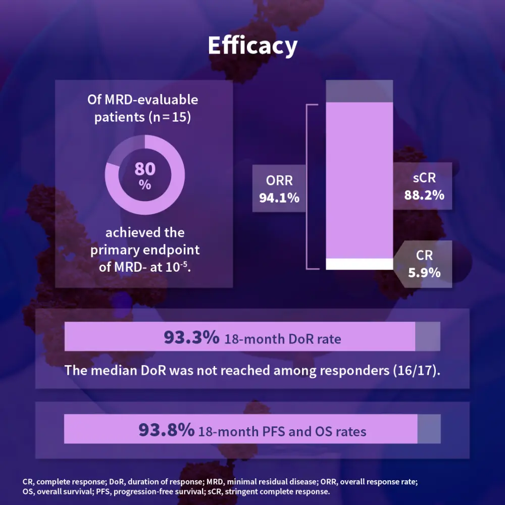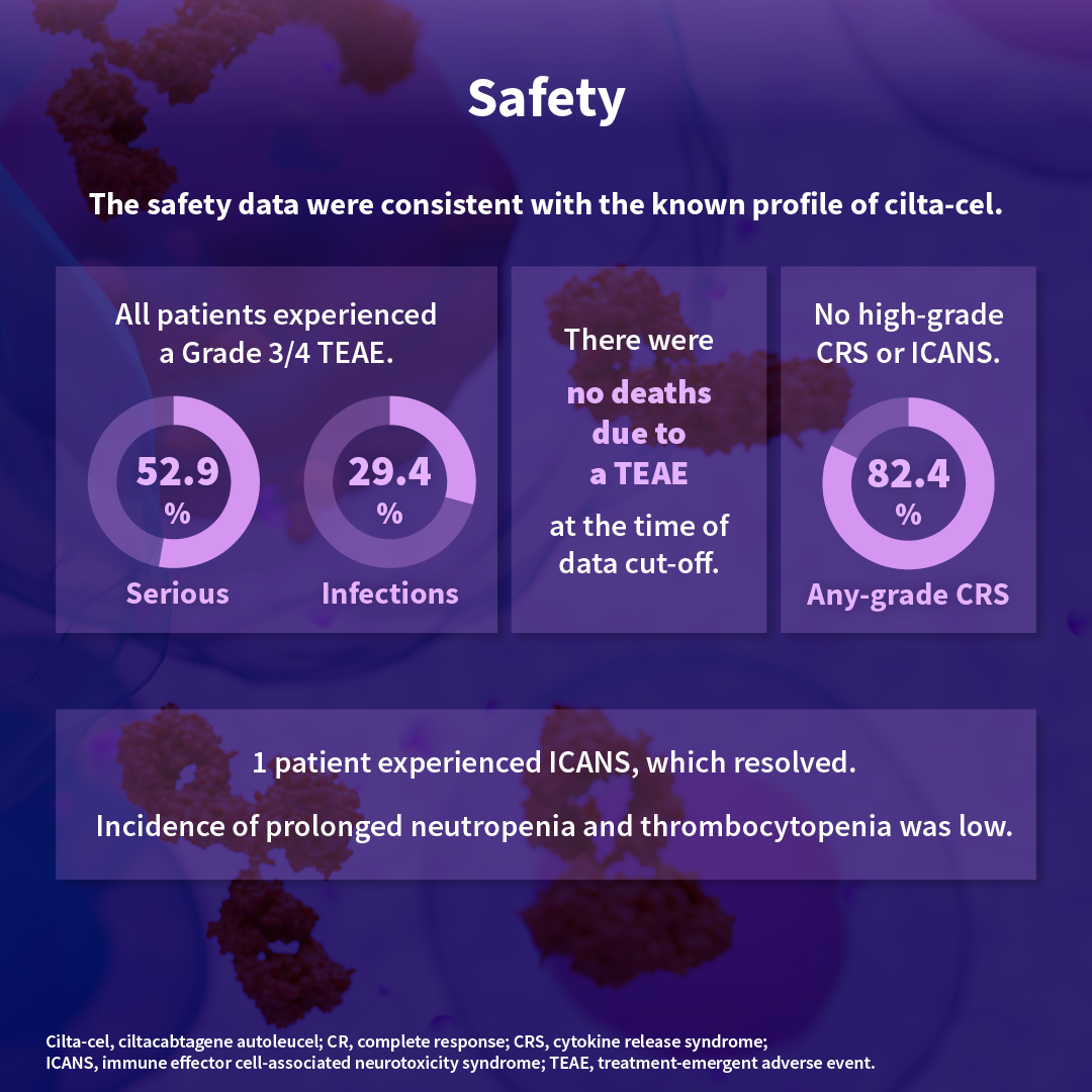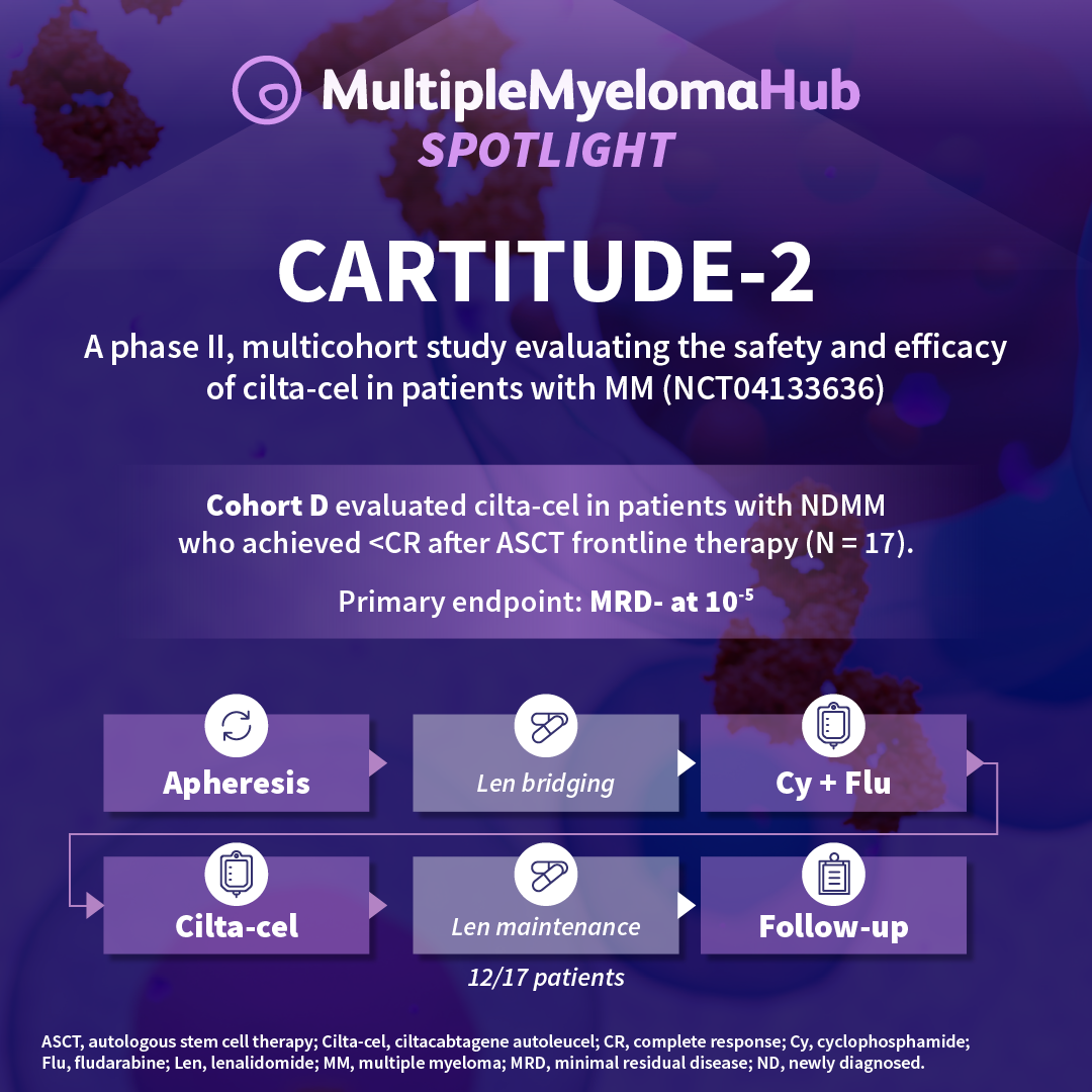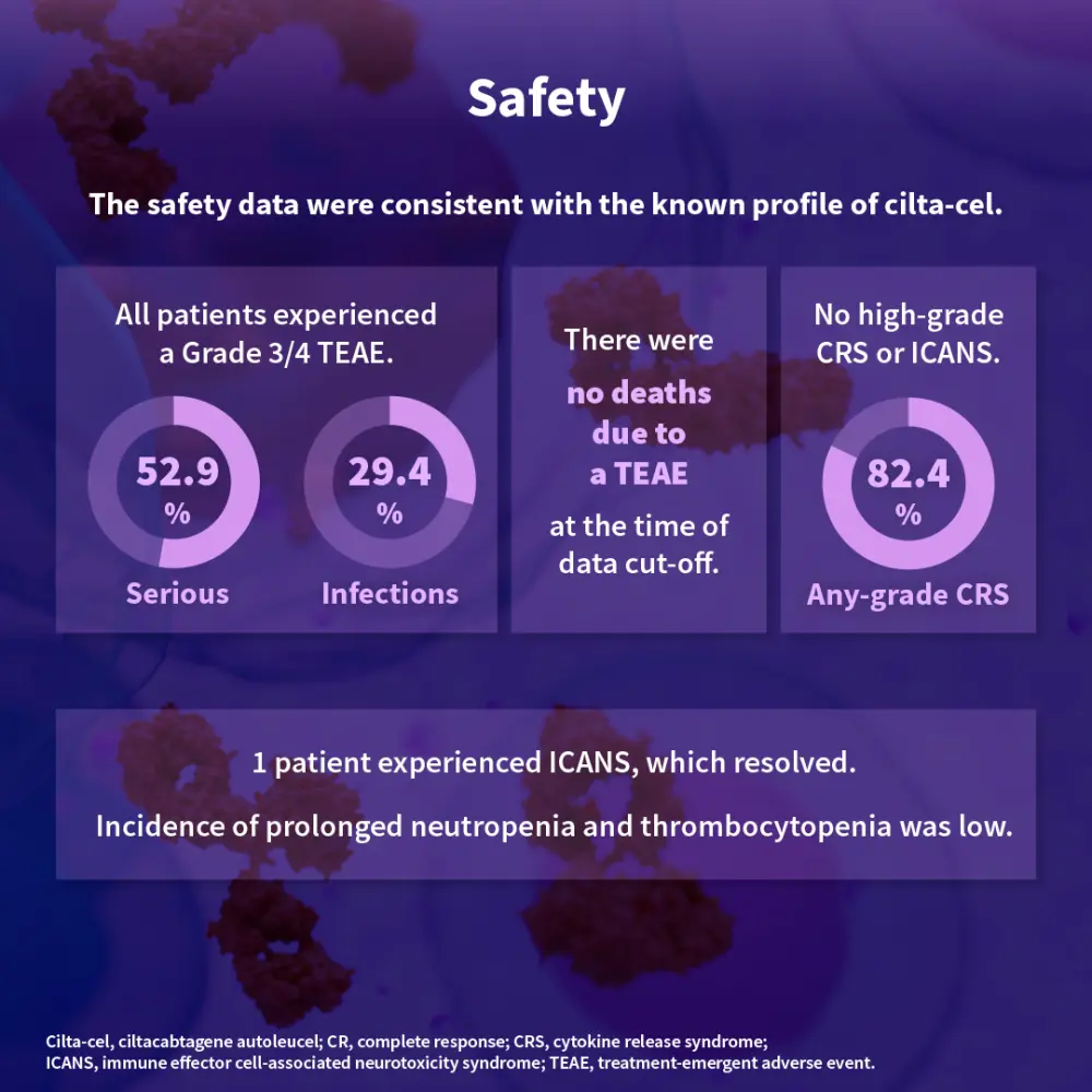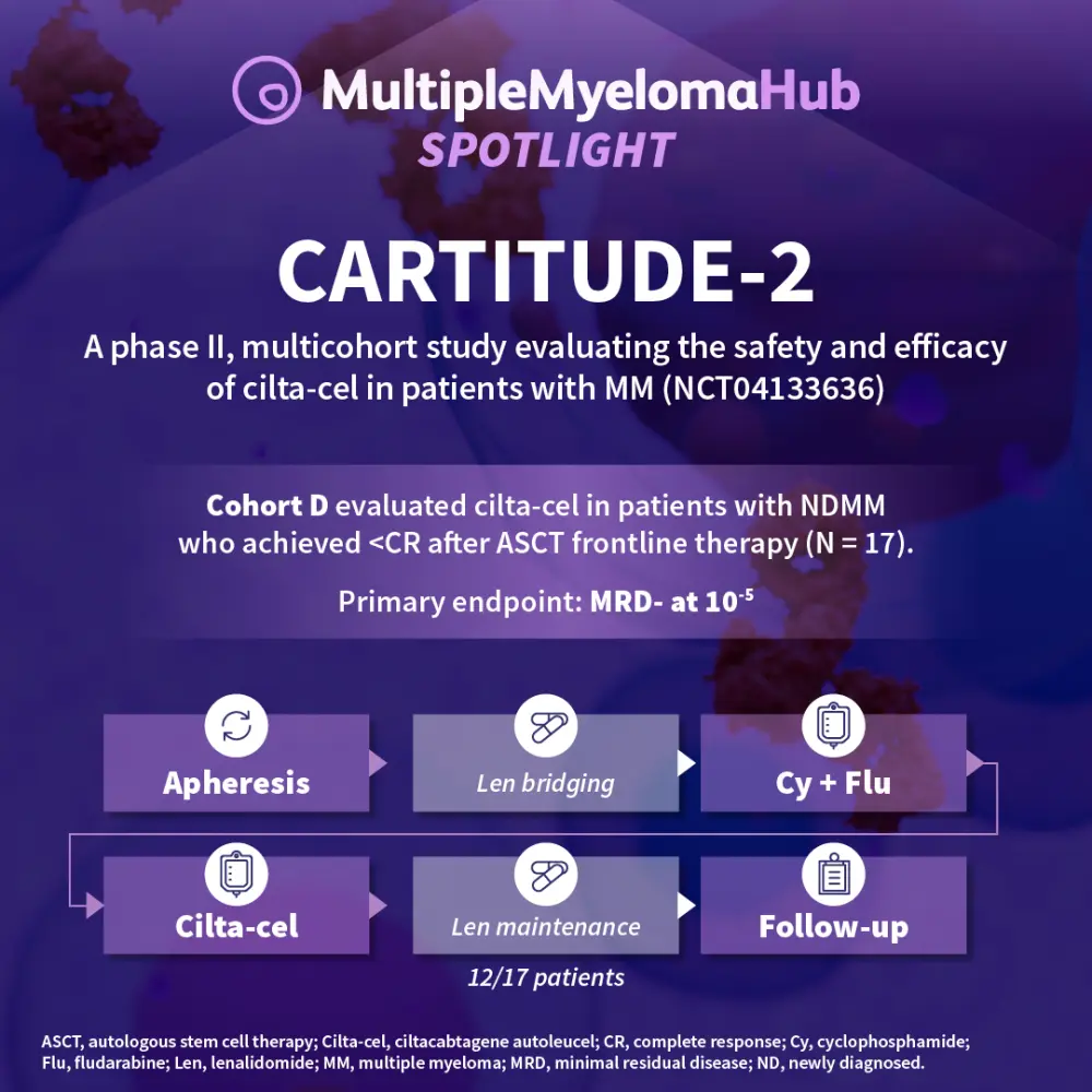 At European Hematology Association Congress 2024, Wilfried Roeloffzen discussed results from Cohort D of the phase II CARTITUDE-2 trial (NCT04133636) investigating the safety and efficacy of cilta-cel in patients with clinically high-risk newly diagnosed multiple myeloma who achieved less than a complete response after stem cell transplantation as frontline therapy (N = 17). The primary endpoint of measurable residual disease negativity was achieved in 80% of patients. The overall response rate was 94.1%, 18-month duration of response rate was 93.3%, and 18-month progression-free survival and overall survival rates were 93.8% each, highlighting promising efficacy of cilta-cel with or without lenalidomide maintenance in these patients.