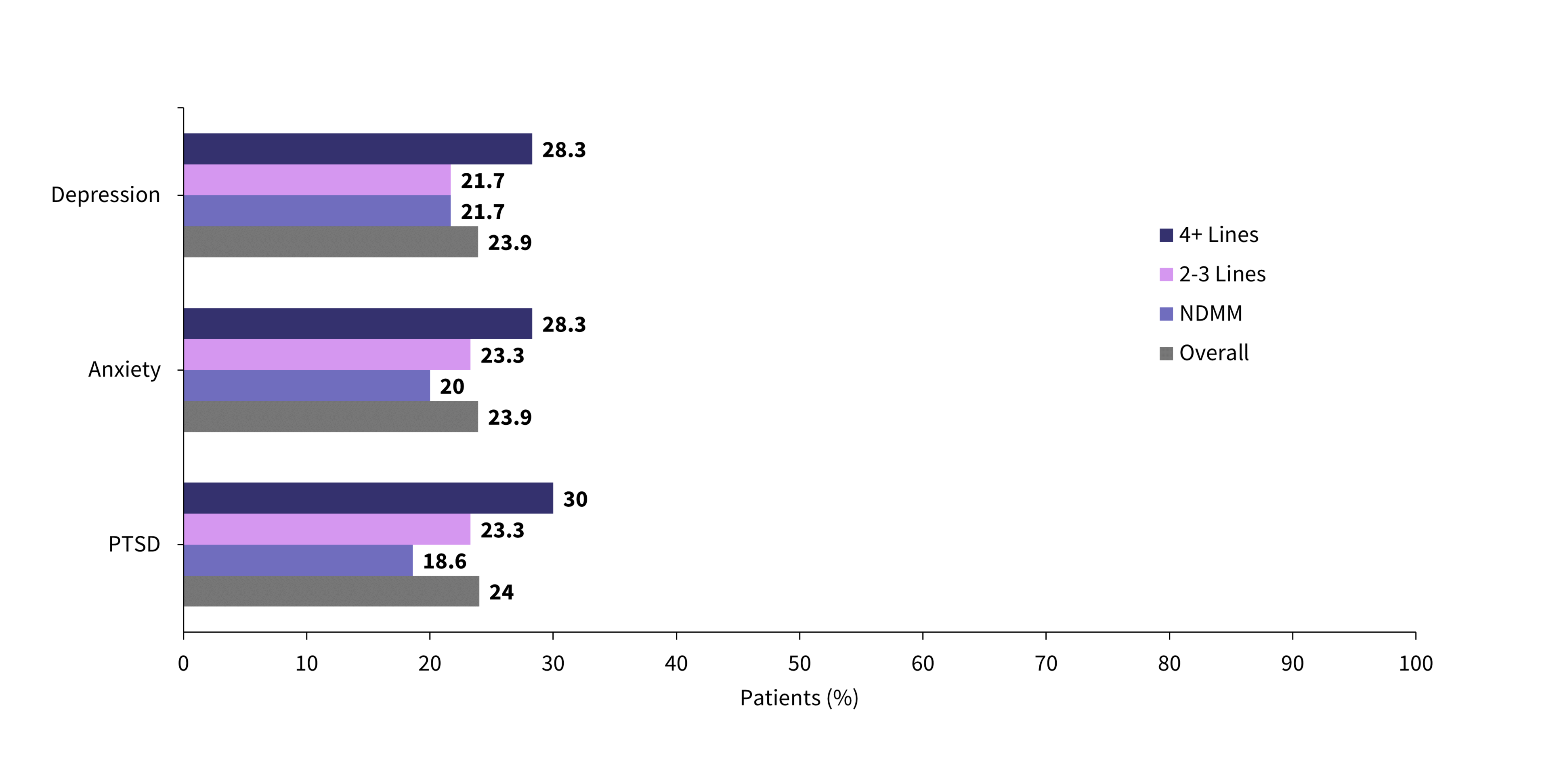 Patients with MM have an increased risk of declining psychological health due to a higher incidence of loneliness and reduced independence, especially in frail patients. Patients with MM have a higher risk of developing mental health conditions, with 12.6% reporting suicidal ideations. Mental health conditions were observed to increase as patients progressed along the lines of therapy (Figure 4).