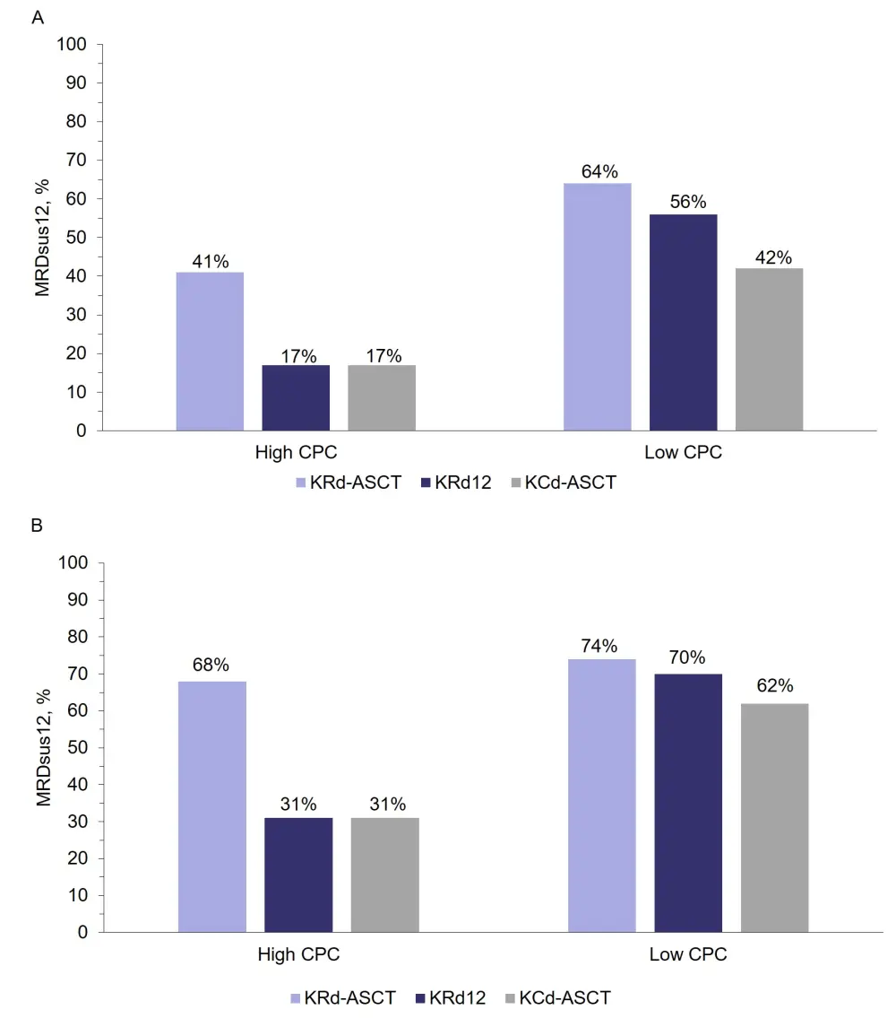 A MRDsus12 rates including all eligible patients (cohort 2), and B MRDsus12 rates considering patients with MRD negativity only; analyzed according to high vs low CPC at time of MM diagnosis2