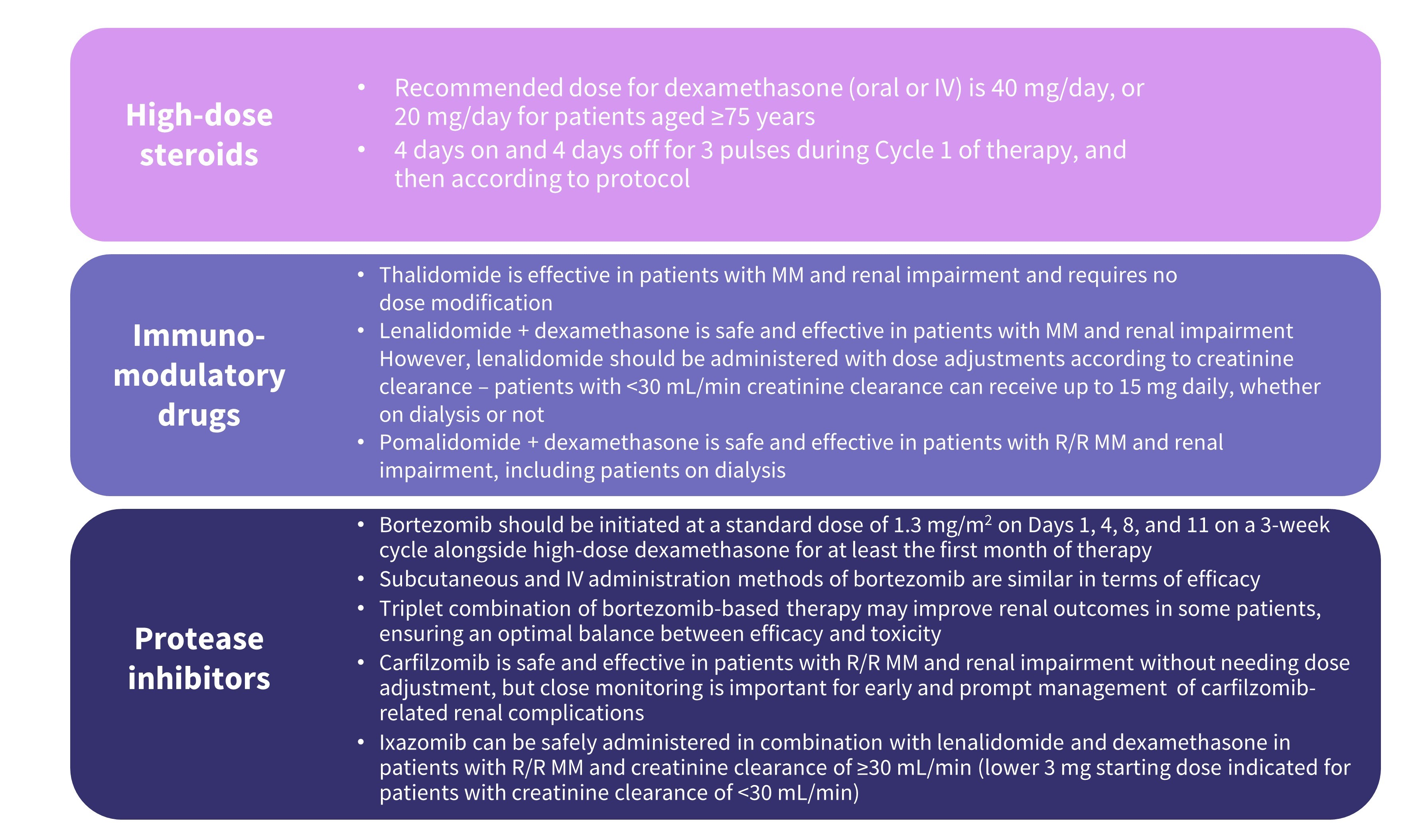 The International Myeloma Working Group (IMWG) recently updated their previous recommendations for the diagnosis and management of renal impairment in patients with MM.1 The recommendations were published by Dimopoulos et al.1 in The Lancet. An interdisciplinary panel comprising clinical experts on MM and renal impairment reviewed and graded the evidence according to Grading of Recommendations, Assessment, Development, and Evaluation system.1 We are pleased to summarize the IMWG recommendations particularly those relating to therapeutic approaches.