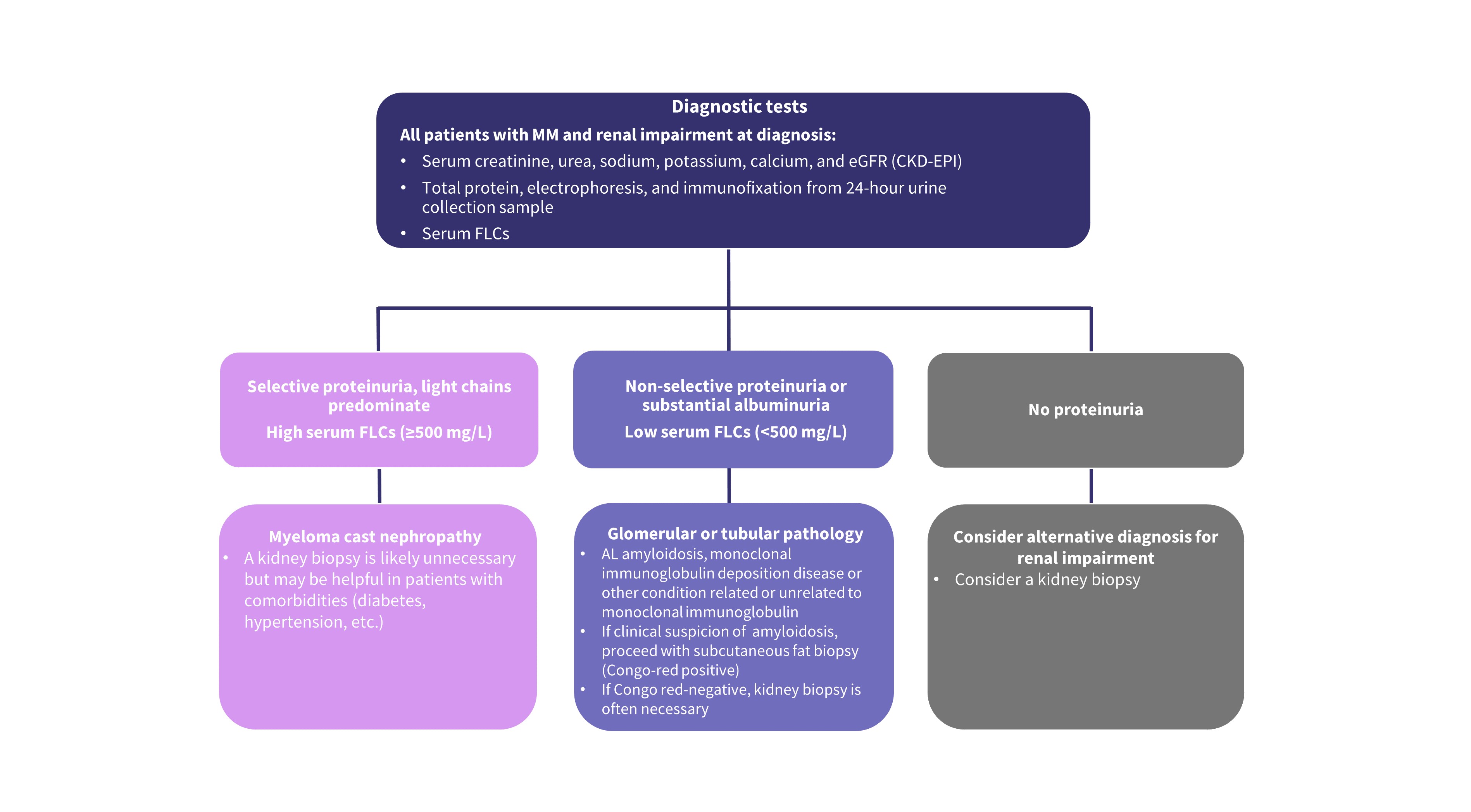 In patients with MM, residual free light chains (FLCs) in the proximal tubules, other co-existing renal diseases, and non-immunoglobulin-related factors have been found to be associated with renal impairment. Early identification and prompt management of renal impairment at diagnosis and relapse is crucial to improve patient outcomes. Figure 1 shows the algorithm for the differential diagnosis of renal impairment in patients with MM.