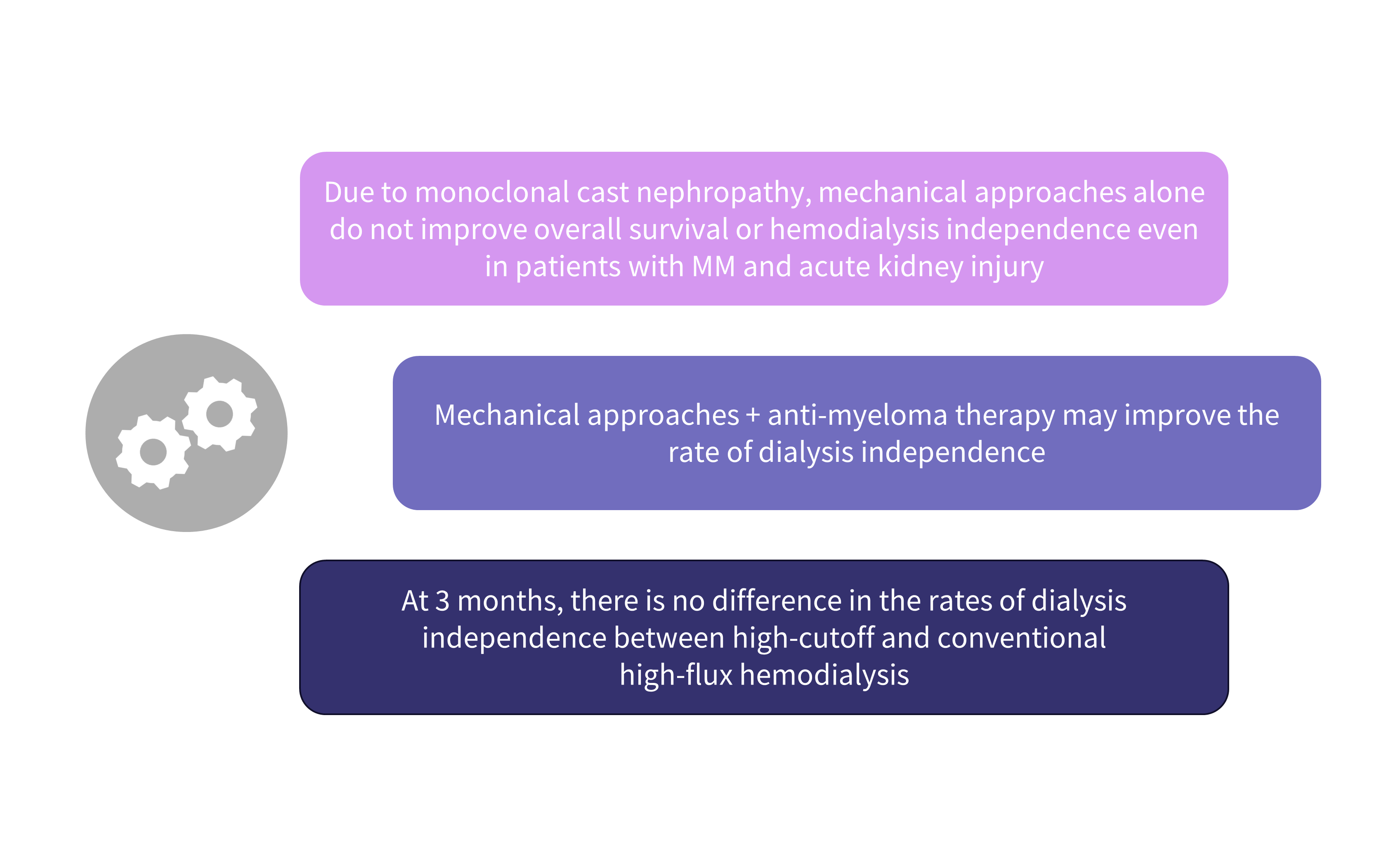 In patients with MM and renal impairment, mechanical approaches have been employed to rapidly decrease the serum FLCs concentrations. In addition, administration of anti-myeloma treatment is also important to reduce the production of monoclonal FLC (Figure 3).