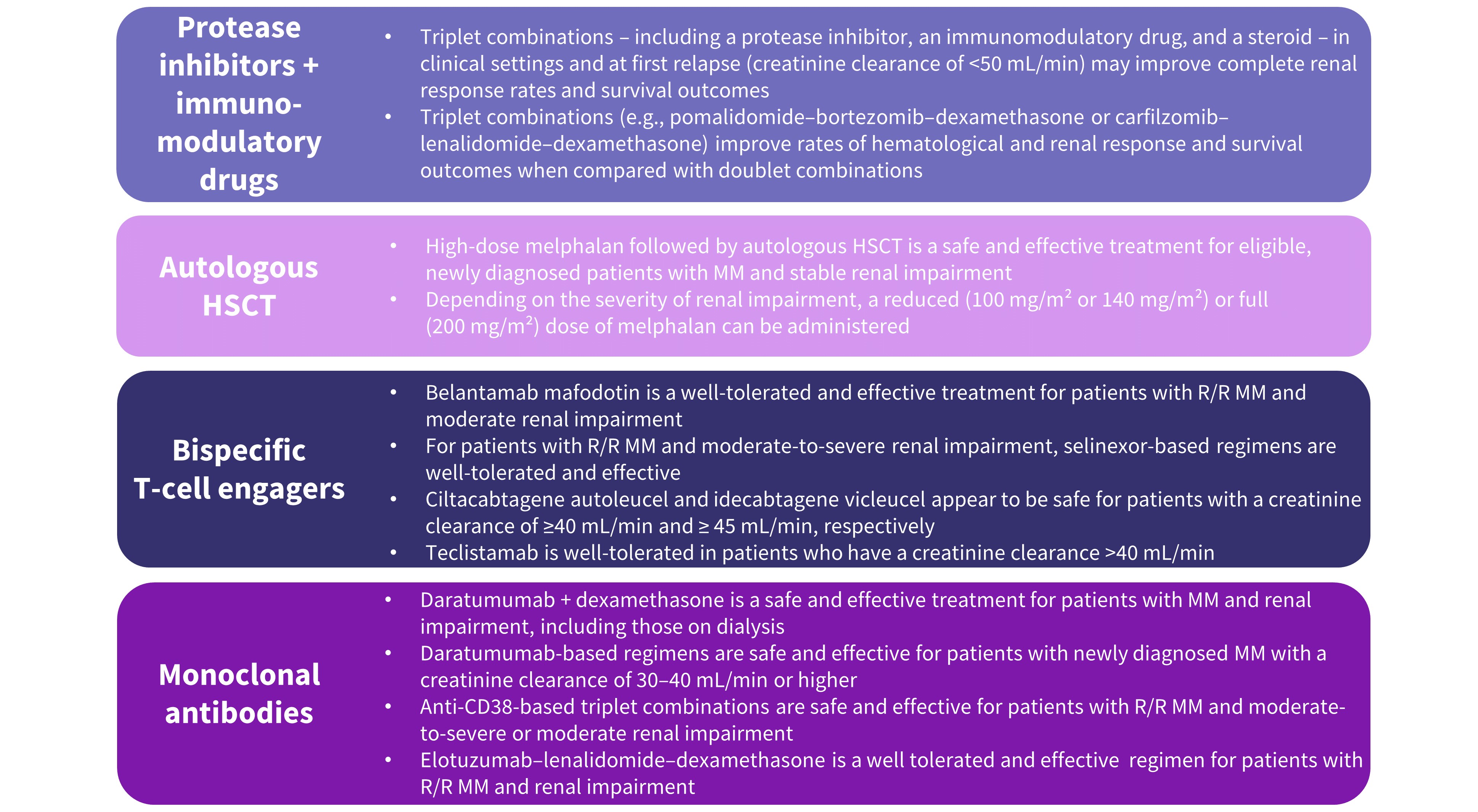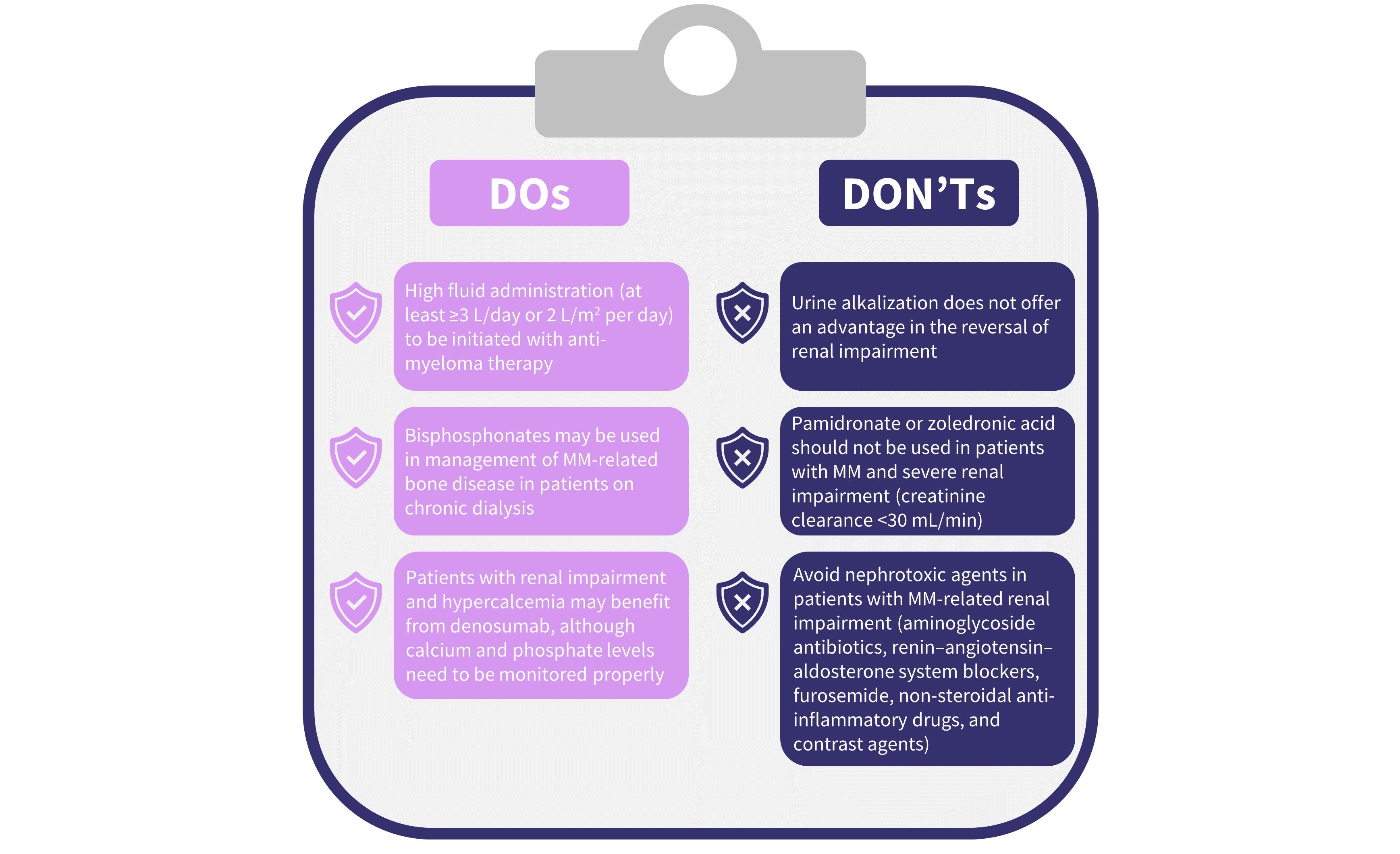 These updated recommendations by IMWG address the therapeutic innovations in MM and the introduction of new options for the management of patients with MM and renal impairment. It also reiterates that diagnosis and management of renal impairment in patients with MM is often challenging and requires a multidisciplinary approach. However, the recommendations are limited by variation in renal impairment definition and exclusion criteria in available studies, inappropriate use of formulae for the estimation of renal function in chronic kidney disease in patients with acute kidney injury, potential differential diagnosis of renal impairment in patients with MM, and the lack of prospective data. Future studies should address these limitations to optimize clinical practice and patient outcomes.