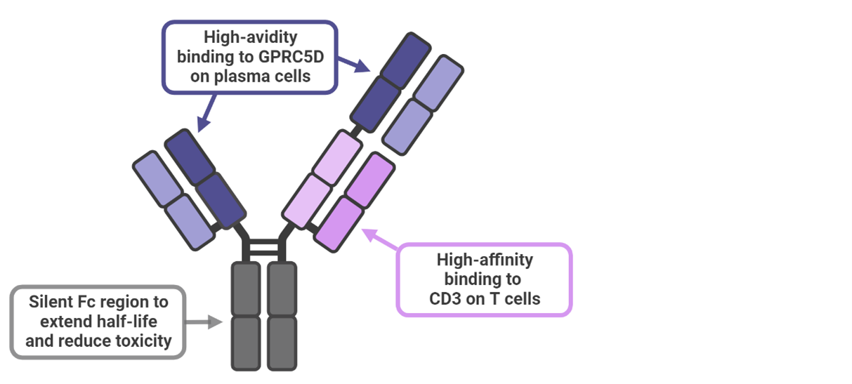 Forimtamig utilizes a dual-binding mechanism, binding with high-avidity to GPRC5D on plasma cells and high-affinity to CD3 on T cells, which induces T-cell activation and killing of malignant plasma cells. Forimtamig also features a silent Fc region that reduces toxicity and increases its half-life. The configuration of forimtamig is shown in Figure 1.