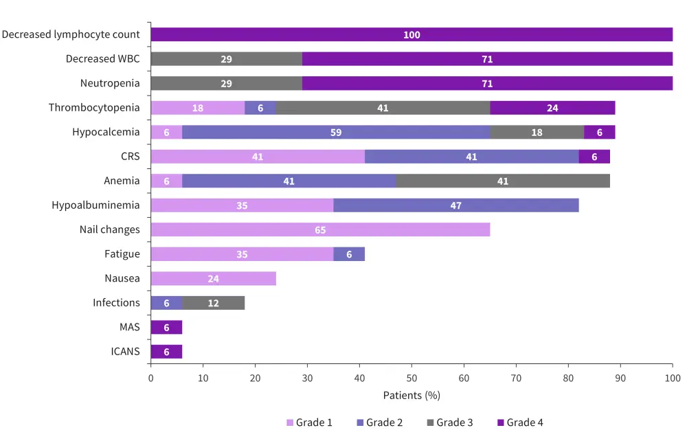 CRS, cytokine release syndrome; ICANS, immune effector cell-associated neurotoxicity syndrome; MAS, macrophage activation syndrome; WBC, white blood cells.