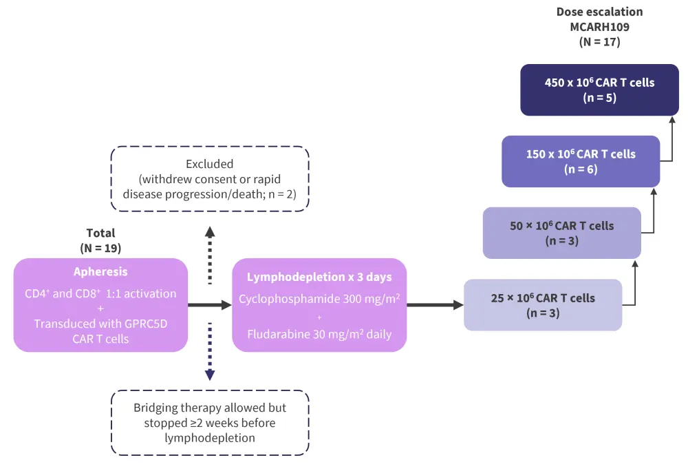 The study was an open-label, phase I, single-center, dose-escalation trial (NCT04555551) in heavily pretreated patients aged ≥18 years with relapsed/refractory MM, who had measurable disease, and an Eastern Cooperative Oncology Group performance status score of 0 or 1. Eligible patients underwent apheresis and lymphodepletion followed by a dose escalation phase with a single infusion of MCARH109 (Figure 1). Patients were followed until disease progression, death, or withdrawal.
