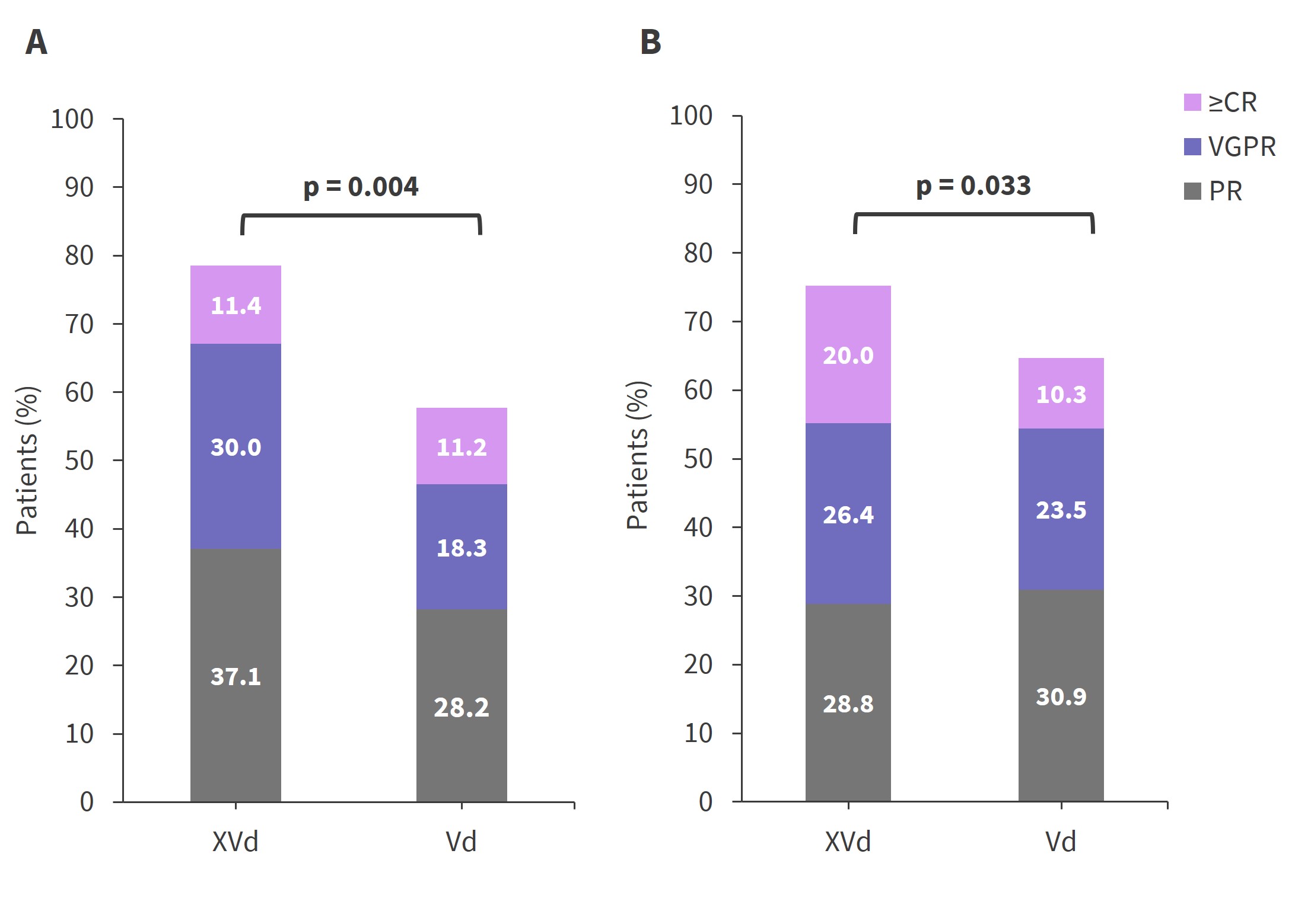 Grade ≥3 adverse events and discontinuations due to adverse events were more frequent with XVd; however, they were deemed to be generally well-managed. In contrast, Grade 2 peripheral neuropathy was less frequent with weekly XVd versus bi-weekly Vd across all subgroups.