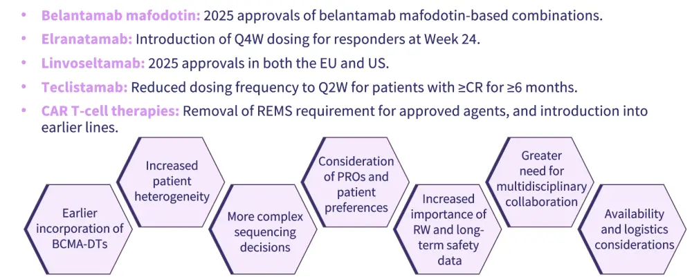 Recent approvals of BCMA-targeted treatments (chimeric antigen receptor [CAR] T-cell therapy, bispecific antibodies [BsAbs], and an antibody–drug conjugate [ADC]) have resulted in their rapid integration into clinical practice, increasing therapeutic options for RRMM while making sequencing decisions more complex.1