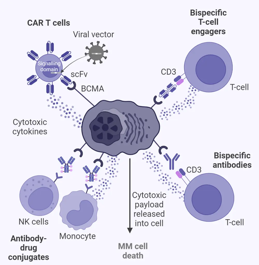 Ab, antibody; BCMA, B-cell maturation antigen; BM, bone marrow; CAR, chimeric antigen receptor; FcRH5, Fc receptor-homolog 5; GC, germinal center; GPRC5D, G protein–coupled receptor class C group 5 member D; IFN, Interferon; IL, interleukin; MM, multiple myeloma; NK, natural killer; PC, plasma cell; RR, relapsed/refractory; scFv, single-chain fragment variable; SLAM, signaling lymphocytic activation molecule; TNF, tumor necrosis factor.