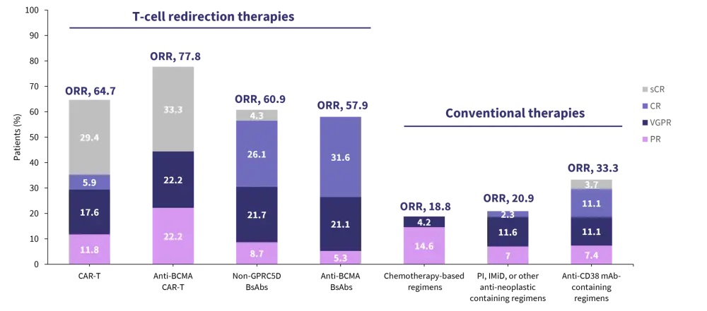 BsAb, bispecific antibody; CAR, chimeric antigen receptor; CR, complete response; GPRC5D, G protein–coupled receptor, class C group 5 member D; IMiD, immunomodulatory agent; mAb, monoclonal antibody; ORR, overall response rate; PI, proteosome inhibitor; PR, partial response; sCR, stringent complete response; VGPR, very good partial response.
