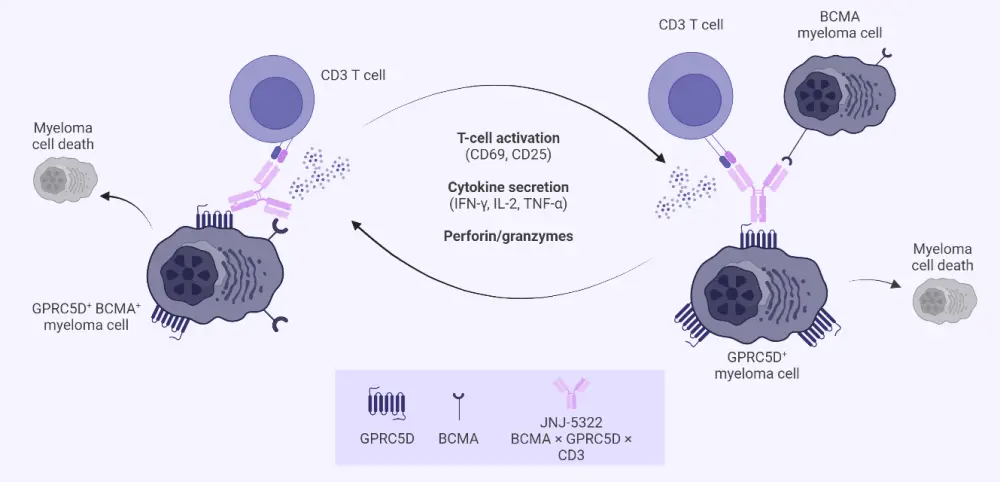 Figure 1. Mechanism of action of JNJ-79635322, a potential first-in-class trispecific antibody targeting BCMA, GPRC5D, and CD3