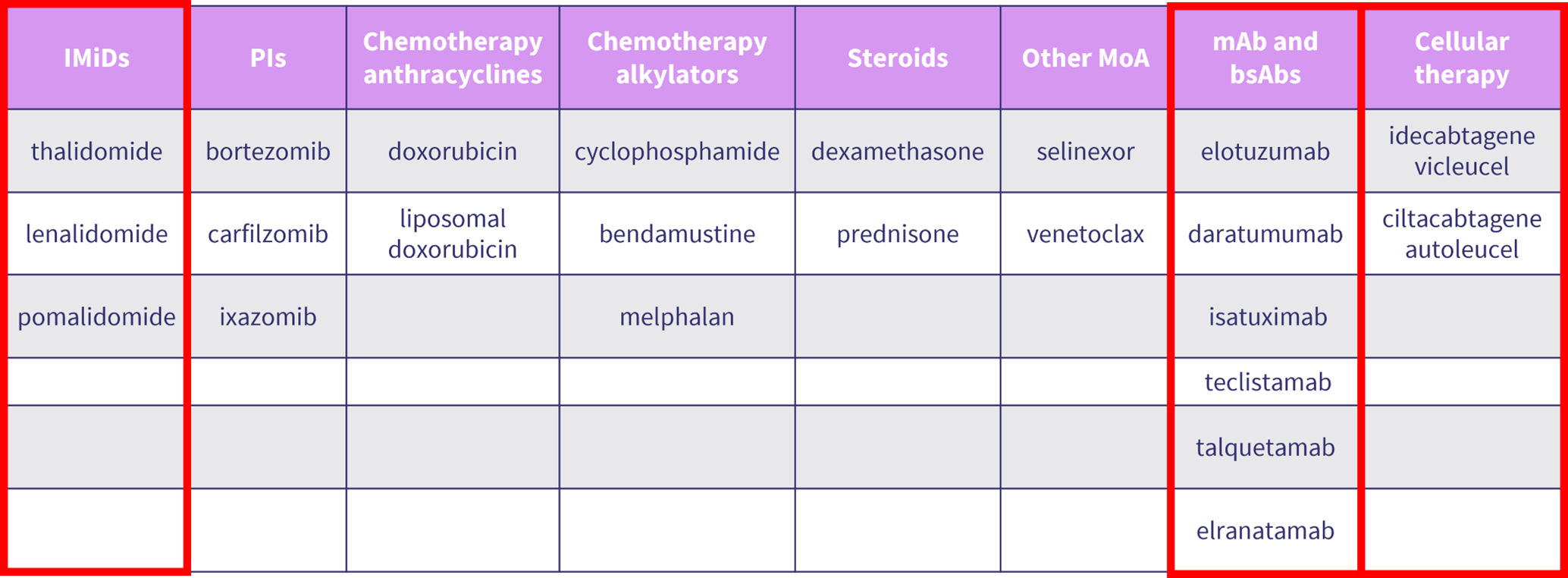 BsAb, bispecific antibody; IMiD, immunomodulatory agent; mAb, monoclonal antibody; MoA, mechanism of action; PI, proteosome inhibitor.