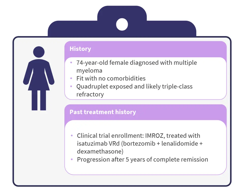 In this panel discussion, Mohty shared a case study of a 74-year-old female patient with RRMM, who experienced progression after 5 years of remission following treatment with isatuximab, bortezomib, lenalidomide, and dexamethasone (Isa-VRd) (Figure 1). This case prompted a discussion on the most effective and practical next-line treatments, considering the benefits and risks of options such as chimeric antigen receptor (CAR) T-cell therapy, bispecific antibodies, antibody–drug conjugates, and other novel combinations.