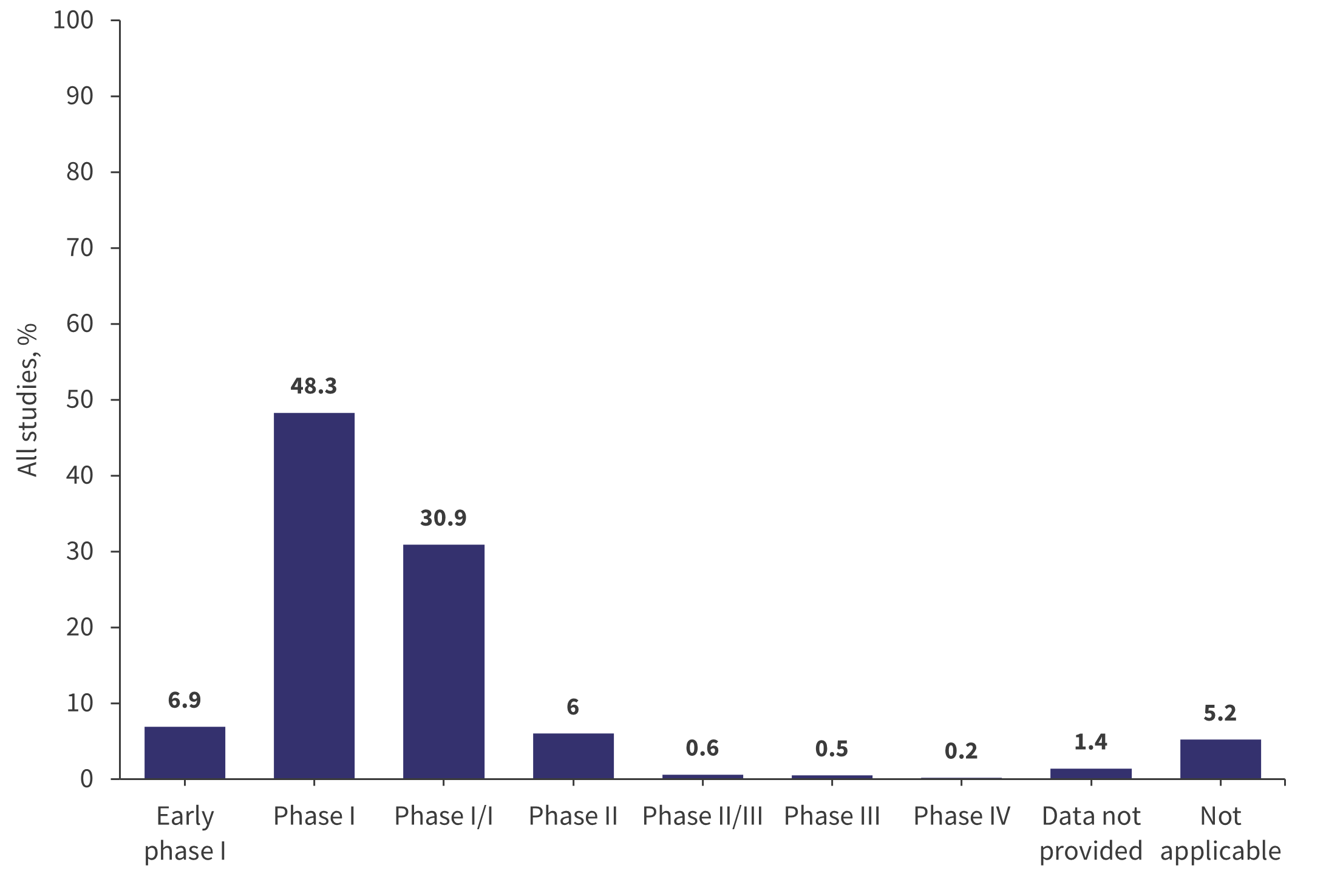 Of the studies included in the article, nearly half were phase I studies and ~80% were phase I or phase I/phase II, which demonstrates that the majority were early phase studies (Figure 2).