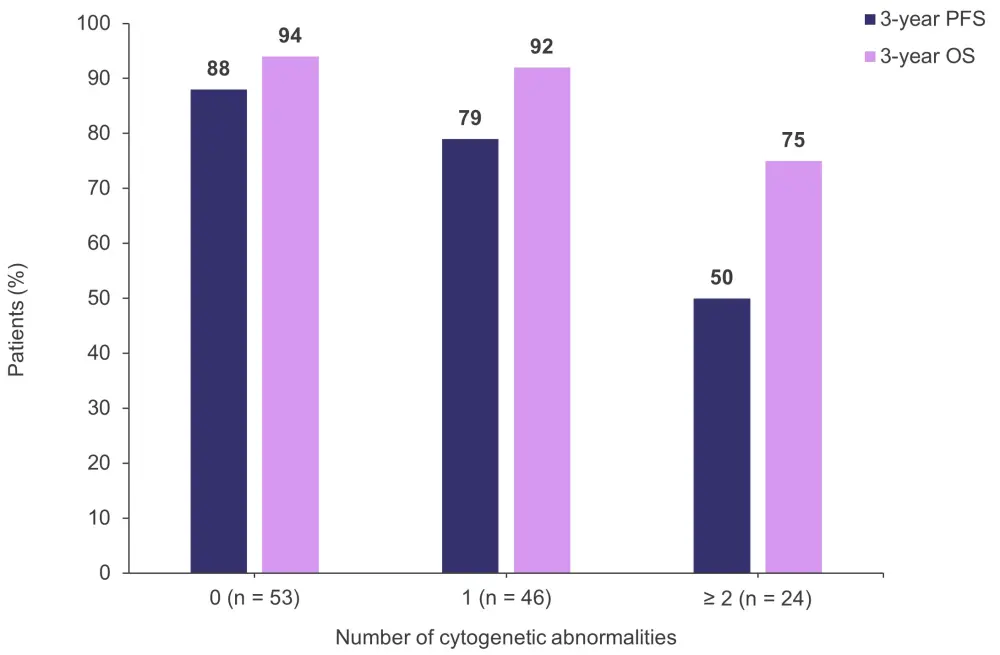 Figure 3. Rates of 3-year OS and 3-year PFS according to the number of high-risk cytogenetic abnormalities in patients who achieved an MRD-negative treatment-free state*
