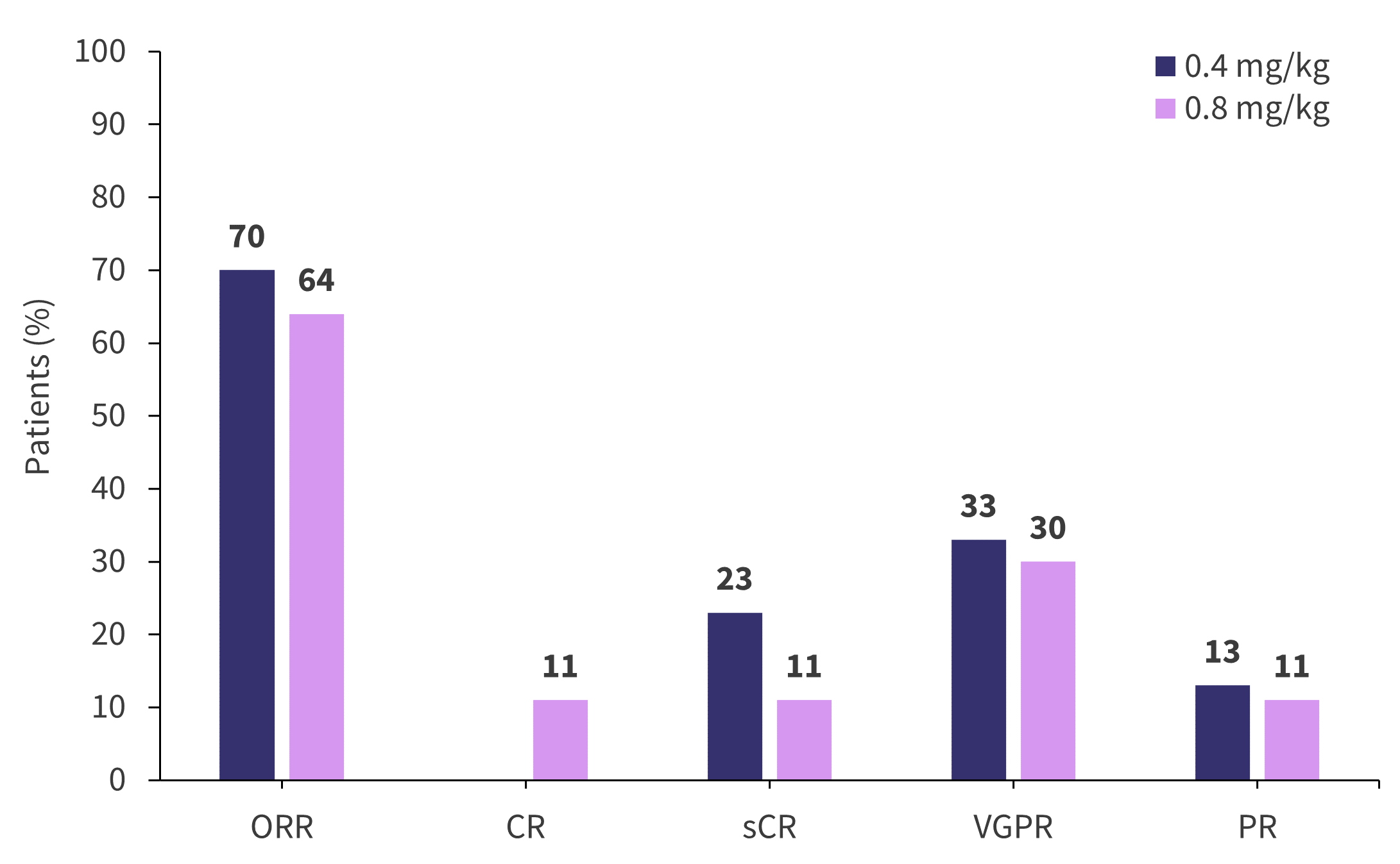 The overall response rate was similar in both the 0.4 mg/kg and 0.8 mg/kg cohorts and was consistent across subgroups:
