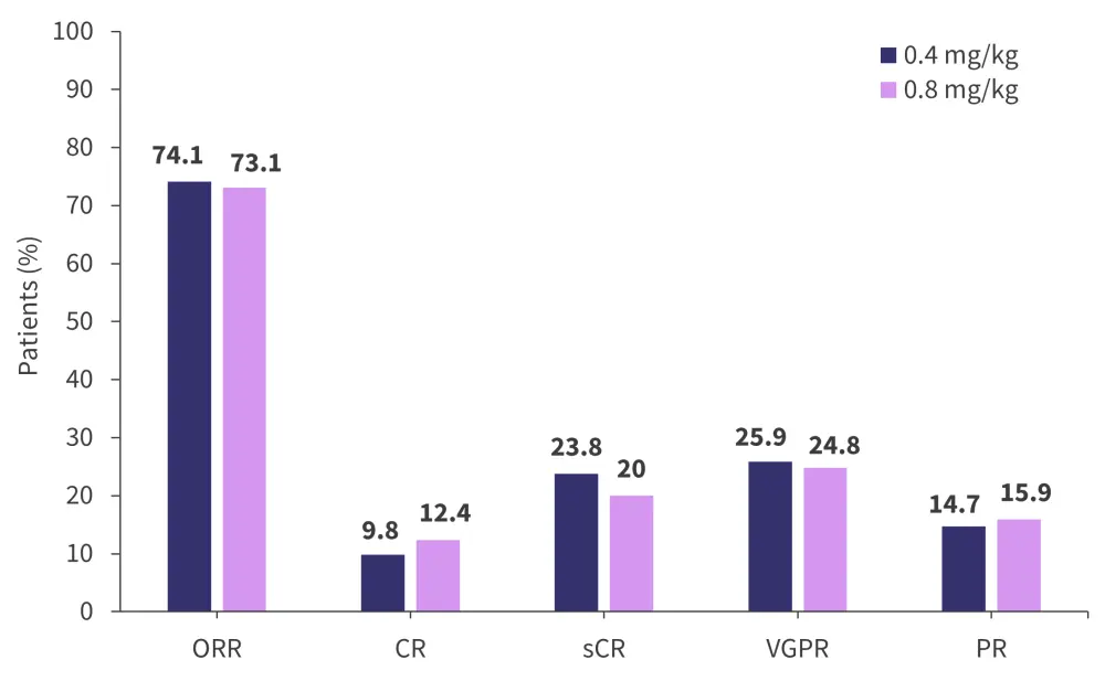 The final response rates for the combined analysis of patients treated with 0.4 mg/kg and 0.8 mg/kg of talquetamab in both the phase I and II parts of the trial are shown in Figure 2.