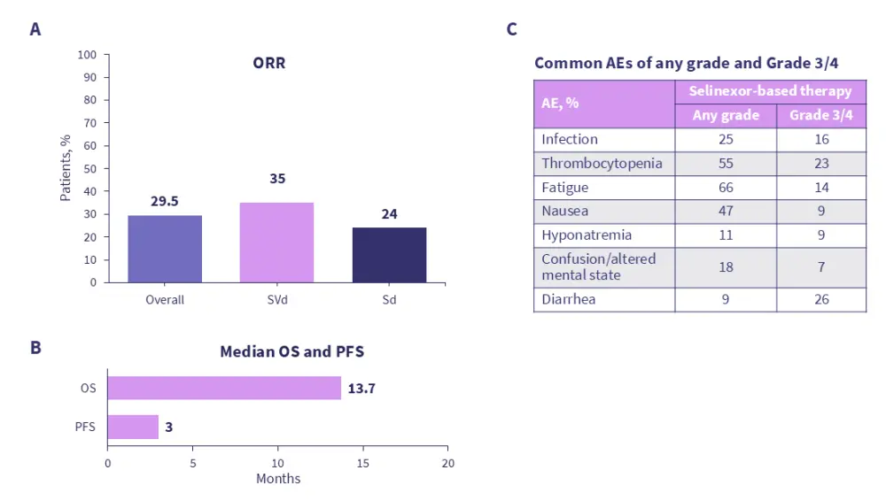 Figure 2. Real-world A response, B survival, and C adverse events associated with selinexor-based regimens*