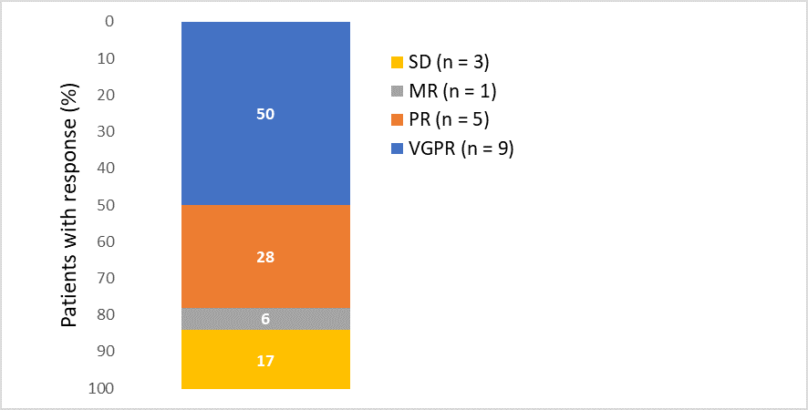 Figure 1. Best confirmed response in patients receiving belamaf 2.5 mg/kg single dose plus Vd. MR, minimal response; PR, partial response; SD, stable disease; VGPR, very good partial response