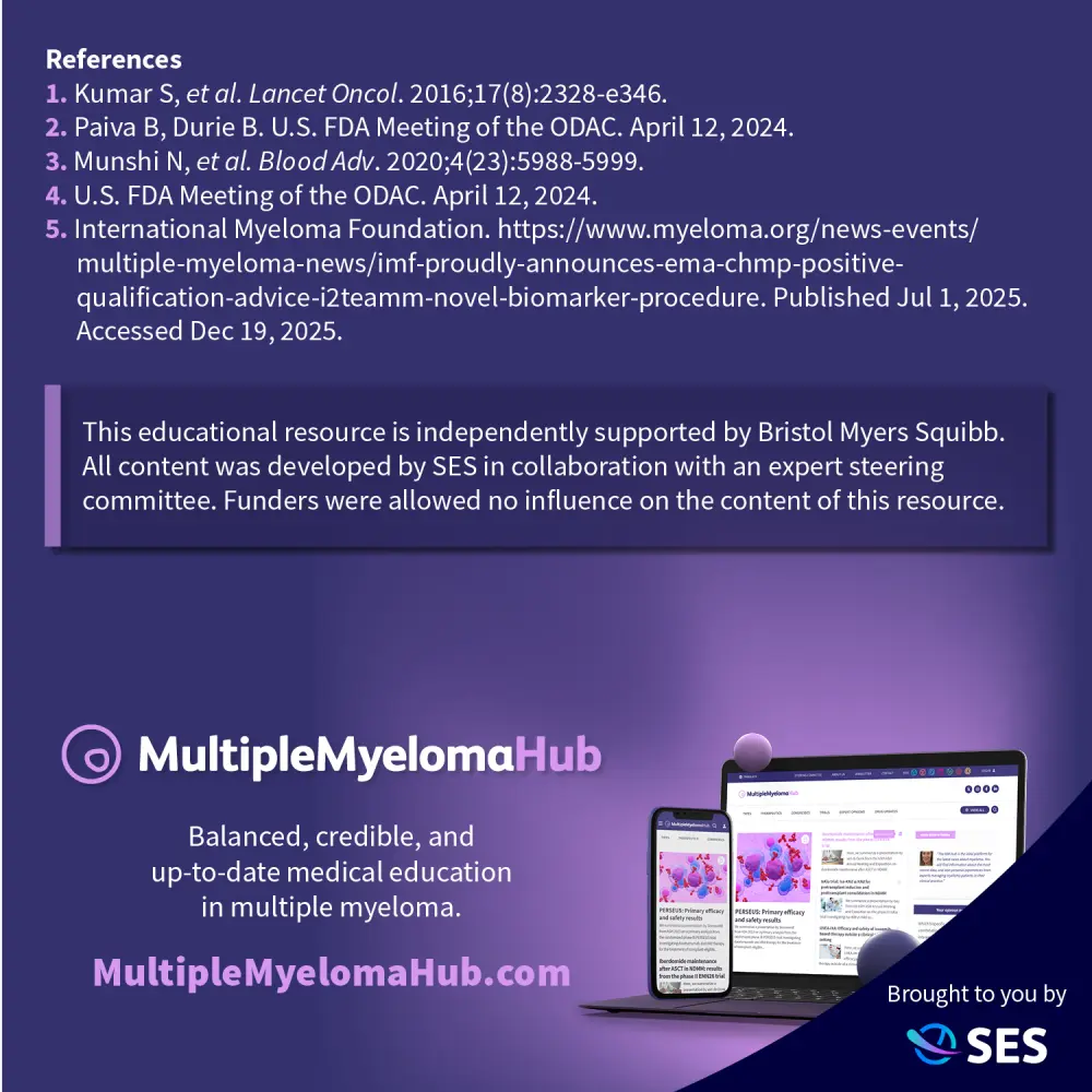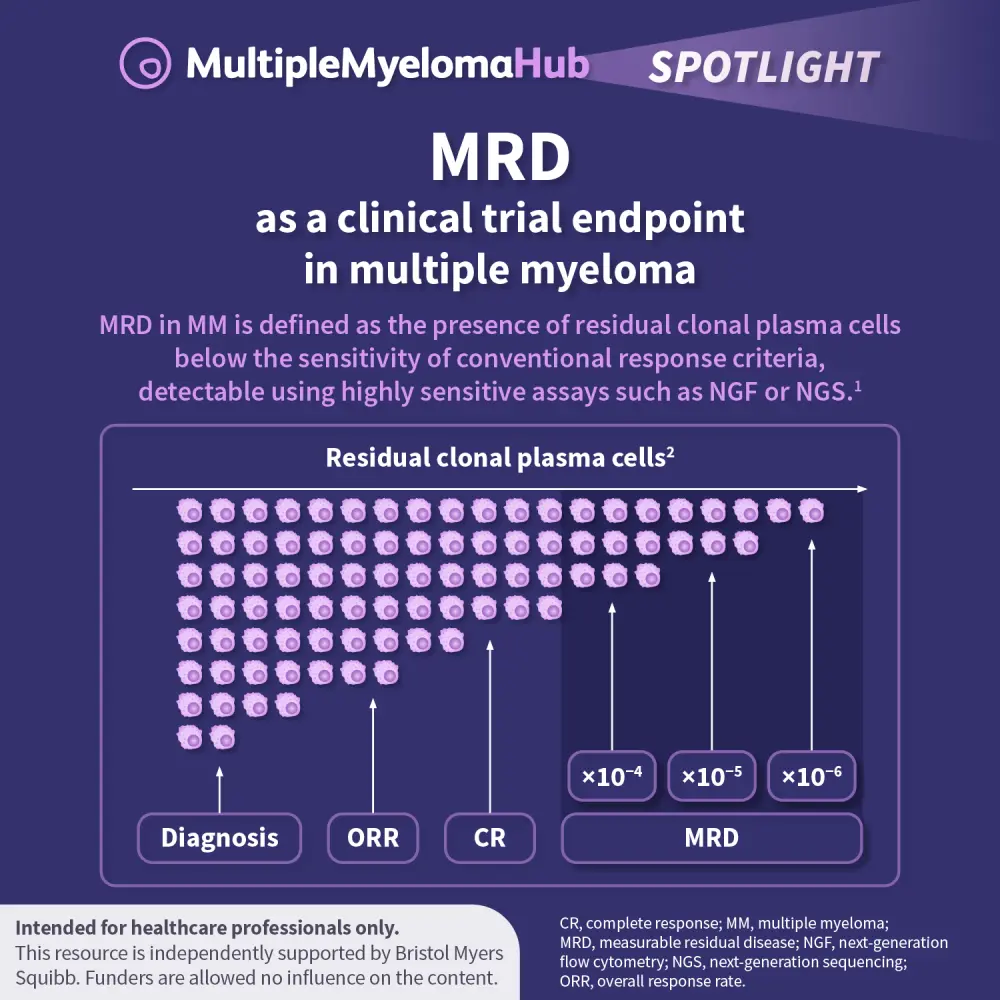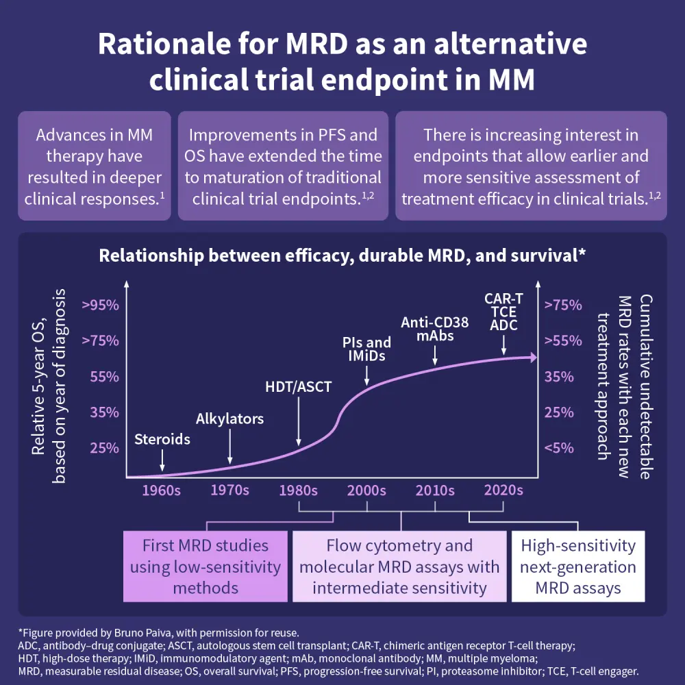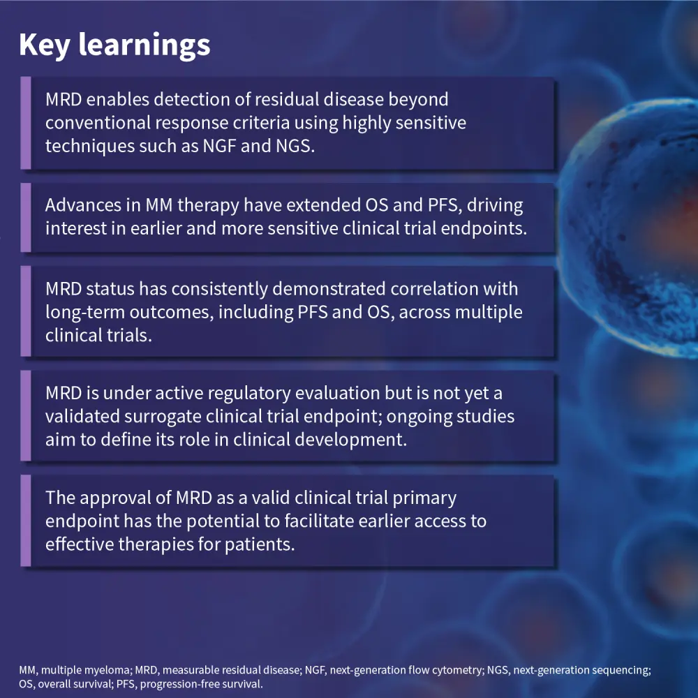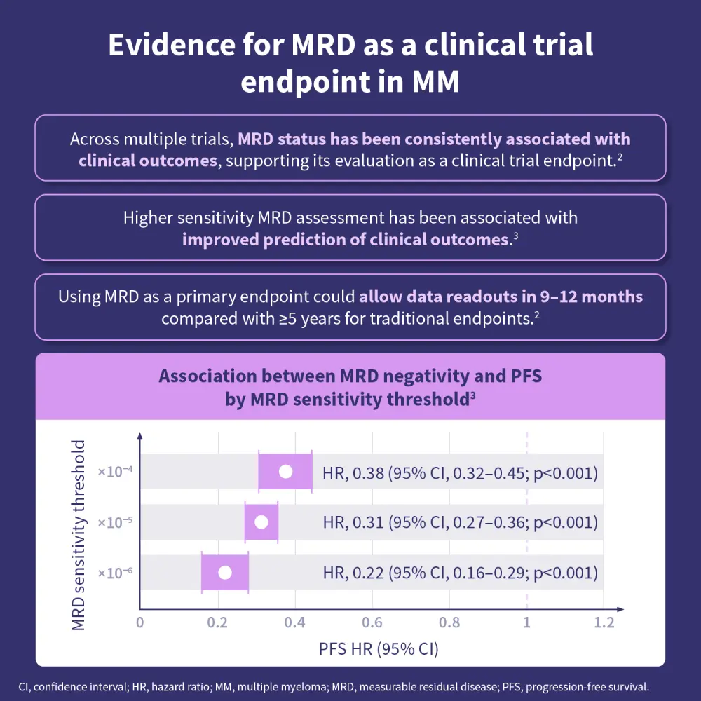 Advances in the treatment of multiple myeloma have resulted in deeper and more durable responses in clinical trials, with corresponding improvements in progression-free and overall survival.1 While these developments reflect important progress, they have also extended the time required for traditional clinical trial endpoints to mature.1 This has led to increased interest in alternative endpoints that may enable earlier and more sensitive assessment of treatment effects.1