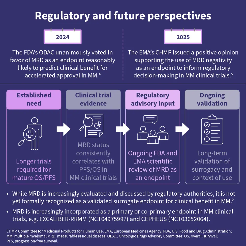 Measurable residual disease (MRD), detected using highly sensitive techniques such as next-generation flow cytometry (NGF) or next-generation sequencing (NGS), has emerged as a potential tool to evaluate depth of response earlier.2 Clinical trial data have demonstrated an association between MRD status and long-term outcomes, supporting ongoing evaluation of MRD as a surrogate clinical trial endpoint in multiple myeloma, potentially accelerating regulatory decision-making.1,3