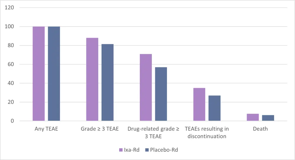 In the study, all patients had a TEAE, with 88.1% of ixa-Rd patients experiencing Grade ≥ 3 compared with 81.4% in the placebo arm, as shown in Figure 3.