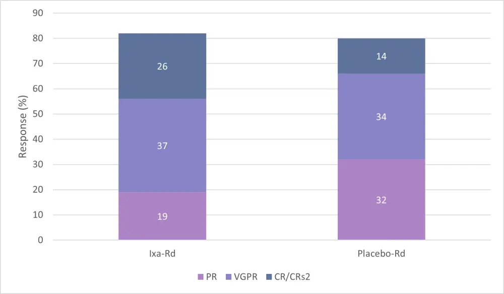 A CR was seen in 26% of patients in the ixa-Rd group, with an overall response rate (ORR) of 82.1% (Figure 2). In the placebo arm, a CR of 14% (p < 0.001) and an ORR of 79.7% were reached, which was not significantly different from the ixa-Rd arm. The difference in the percentage of very good partial responses achieved between groups was significant (p < 0.001).