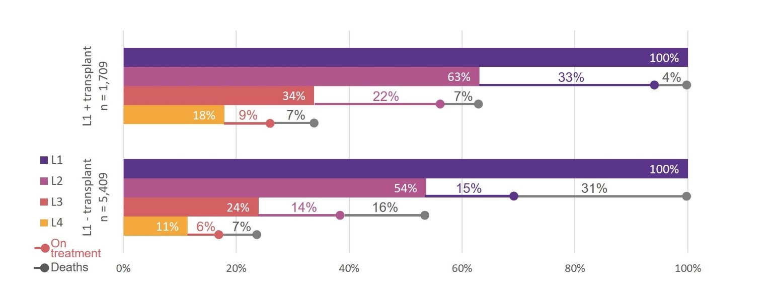 Figure 2. Attrition rates of patients with transplant versus without transplant in first line of treatment (L1)*