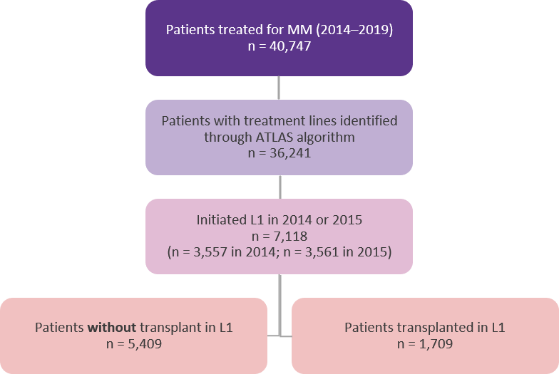 This was a retrospective, observational cohort study using the French administrative health care database (SNIIRAM/SNDS) in patients treated for MM in France during 2014–2019. Patients with a treatment history were identified using an artificial intelligence algorithm (ATLAS) (Figure 1), and treatment lines were reconstructed for these patients to understand the evolution of therapeutic management of MM.