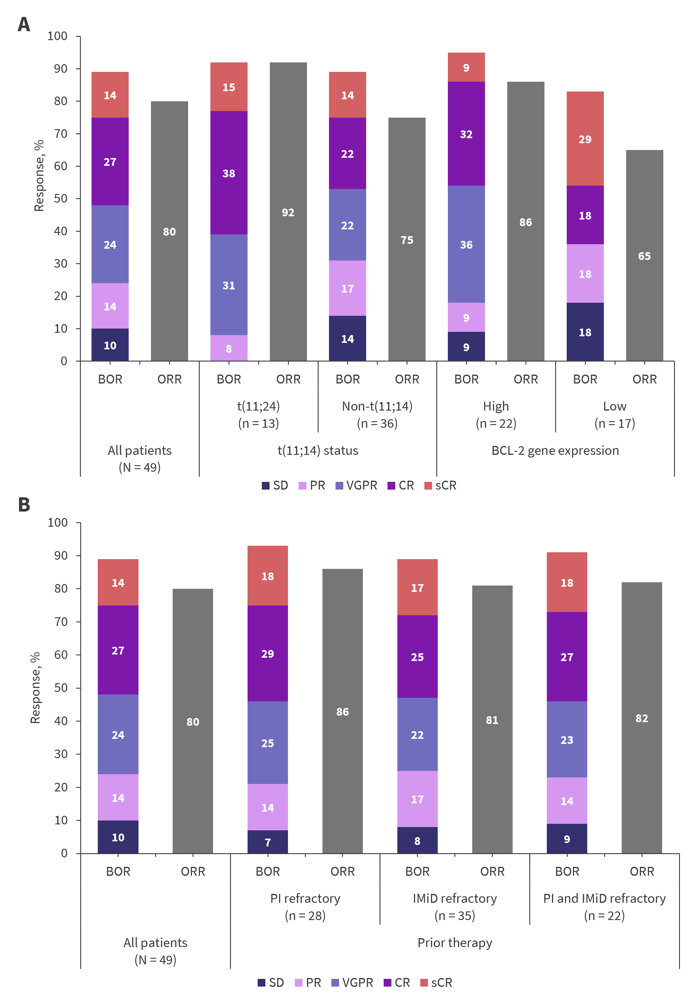BCL2, B-cell lymphoma 2; BOR, best overall response; CR, complete response; IMiD, immunomodulatory drug; ORR, overall response rate; PI, proteasome inhibitor; PR, partial response; sCR, stringent CR; SD, stable disease; VGPR, very good partial response.