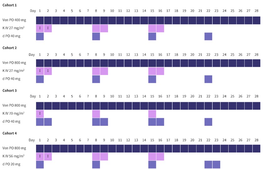 d, dexamethasone; IV, intravenous; K, carfilzomib; PO, oral; Ven, venetoclax.