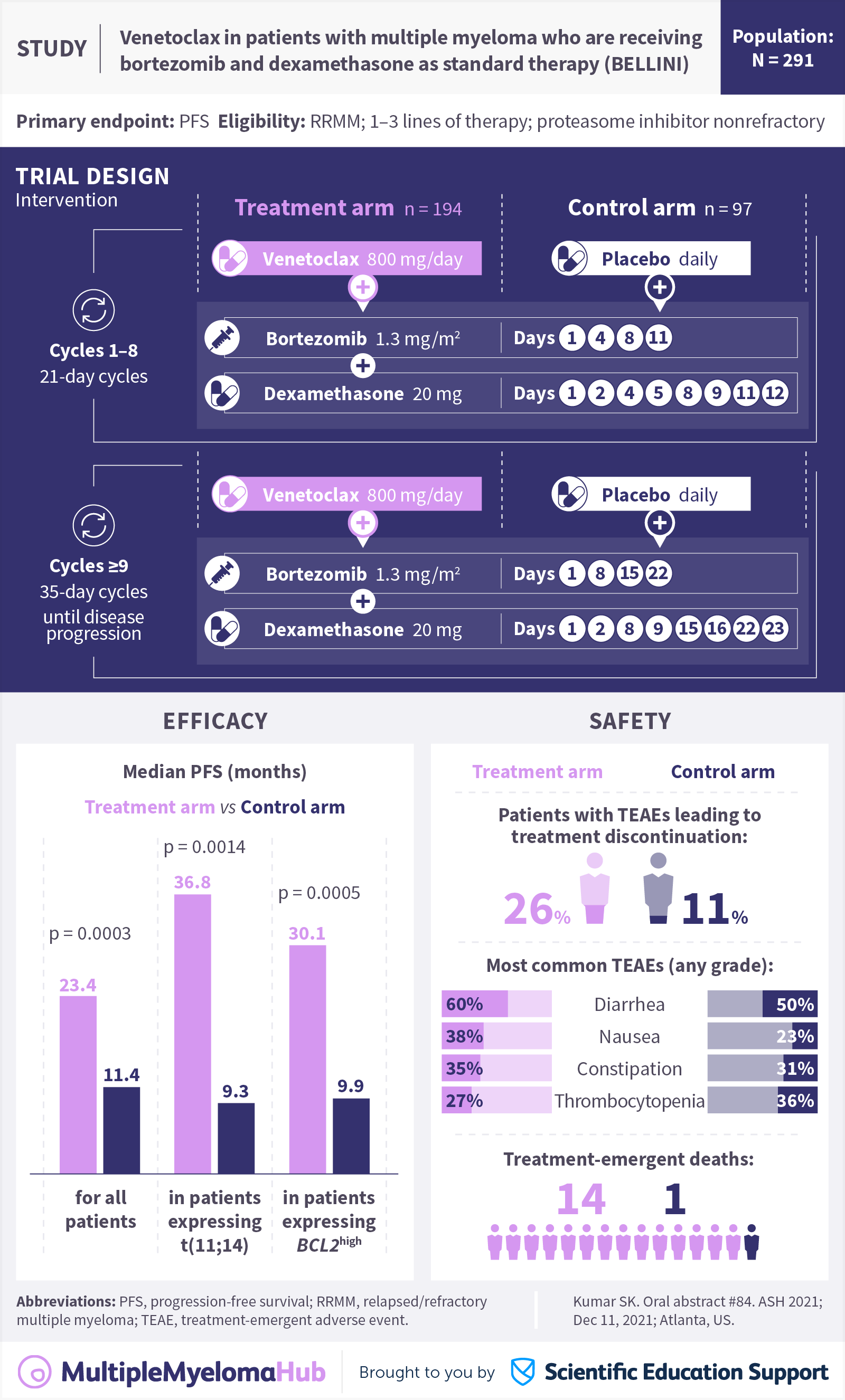 Multiple myeloma (MM) cells are typified by high levels of antiapoptotic proteins, such as BCL-2.1 Use of BCL-2 inhibitors, such as venetoclax, induces apoptosis. When combined with bortezomib and dexamethasone, the BELLINI phase III study demonstrated that venetoclax improved response rates and progression-free survival (PFS) in patients with relapsed/refractory MM (RRMM), though increased mortality was observed in the venetoclax group (baseline characteristics are detailed here). At the 63rd American Society of Hematology (ASH) Meeting and Exposition, Kumar¹ presented updated safety and efficacy data from the final prespecified overall survival (OS) analysis of the BELLINI trial. This is summarized in the visual abstract presented.