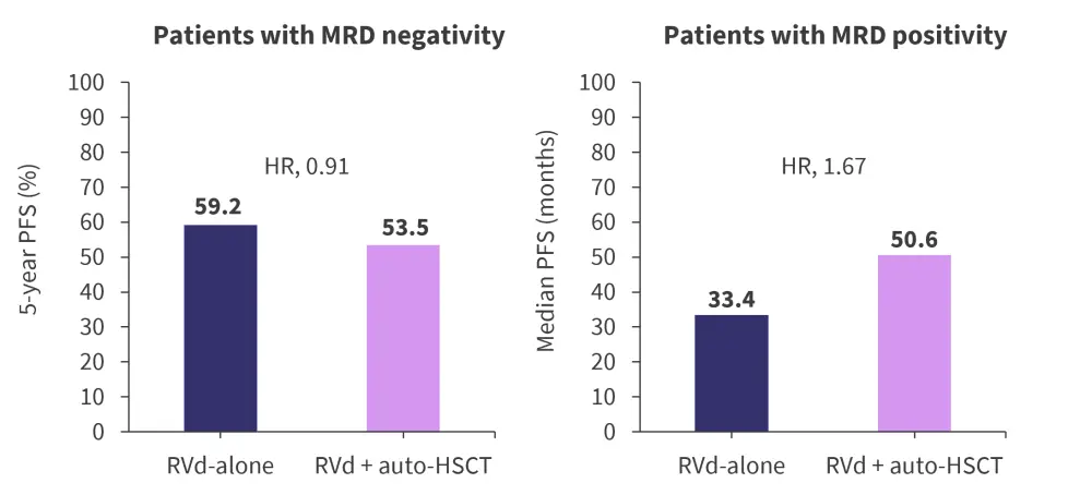 The preliminary analysis evaluating the correlation between PFS and MRD status at the start of maintenance therapy in 198 patients showed a higher rate of MRD negativity in the RVd + auto-HSCT arm compared with the RVd-alone arm (54.4% vs 39.8%; odds ratio, 0.55). Of note, the 5-year PFS was similar among the two arms in patients achieving MRD negativity; however, in patients with MRD positivity, the median PFS was longer in the RVd + auto‑HSCT arm compared with the RVd-alone arm (Figure 4).