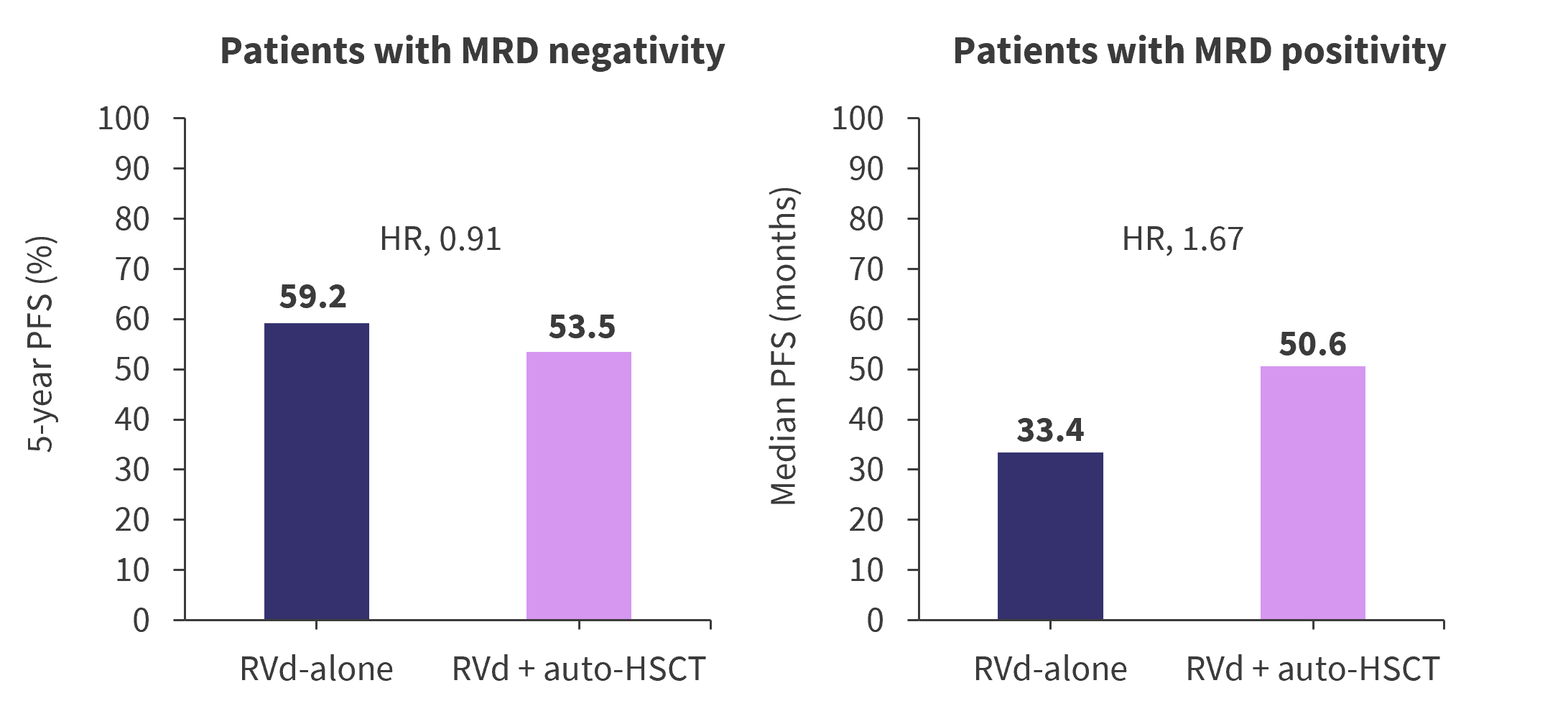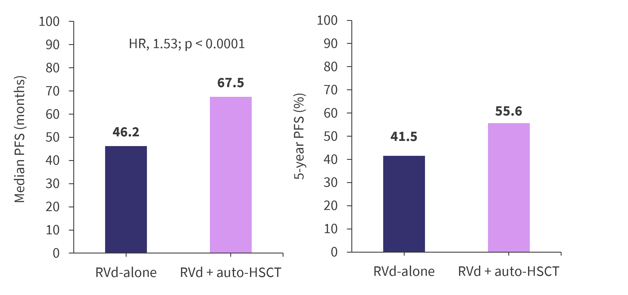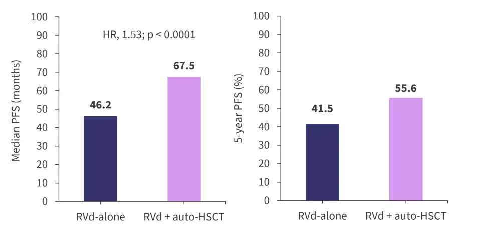 At a median follow-up of 76 months, the primary endpoint was met with a net gain of >21 months for the median duration of PFS with frontline auto-HSCT. Both I median duration of PFS and 5-year PFS were higher in the RVd + auto-HSCT arm versus the RVd alone arm, demonstrating a 53% increased risk of progression or death with RVd alone, as shown in Figure 2. PFS for prespecified key groups are shown in Table 2.