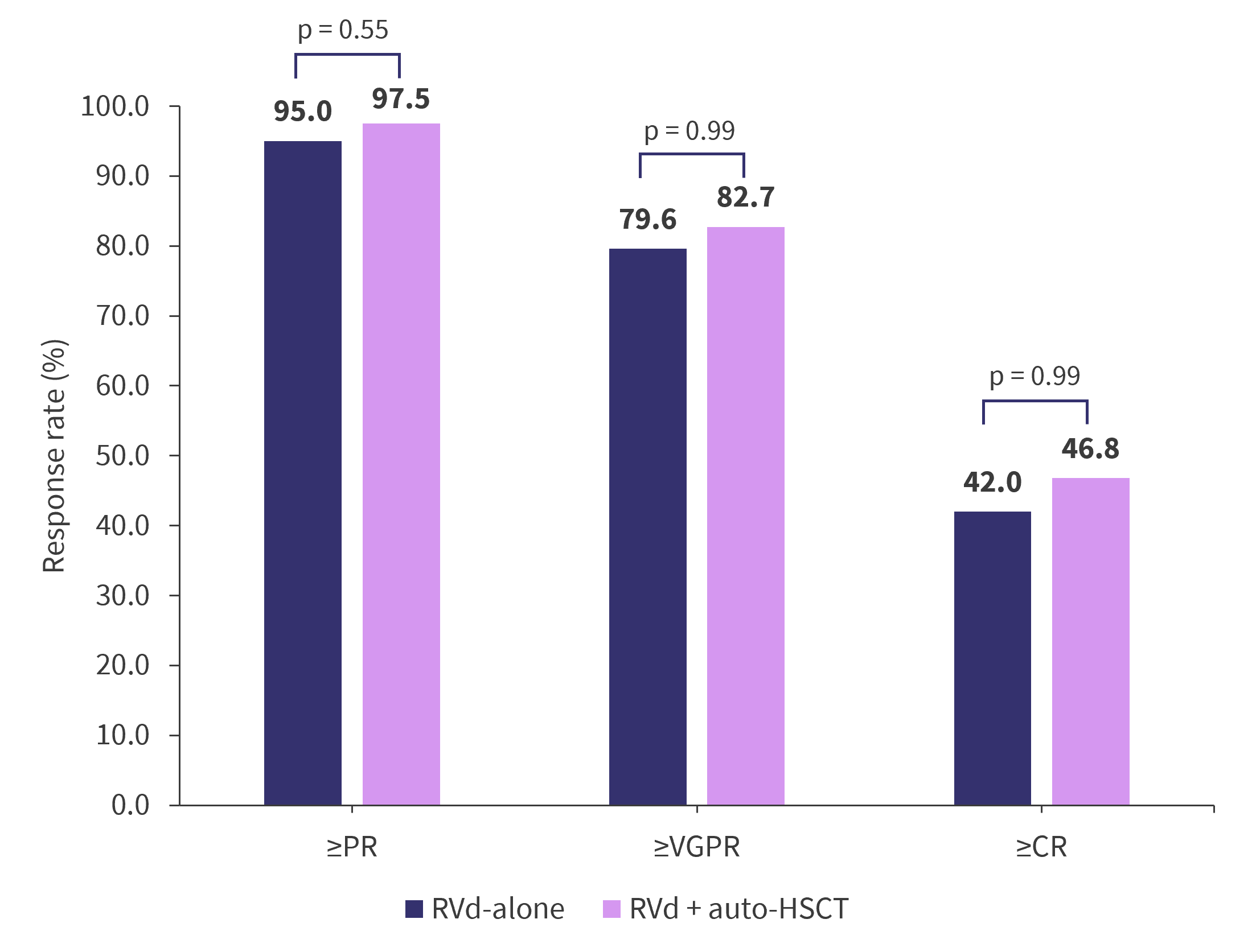 The response rates were similar in the RVd + auto-HSCT and RVd-alone arms, except when analyzing rates of elimination of minimal residual disease (MRD), as shown in Figure 3. Interestingly, the median DOR was statistically longer in patients achieving at least a partial response in the RVd + auto‑HSCT arm compared with RVd-alone arm (56.4 months vs 38.9 months; HR, 1.45; p = 0.003). However, the difference in 5-year DOR narrowed and was no longer statistically significant in patients achieving at least a complete response (60.6 months vs 52.9 months; HR, 1.35; p = 0.698).
