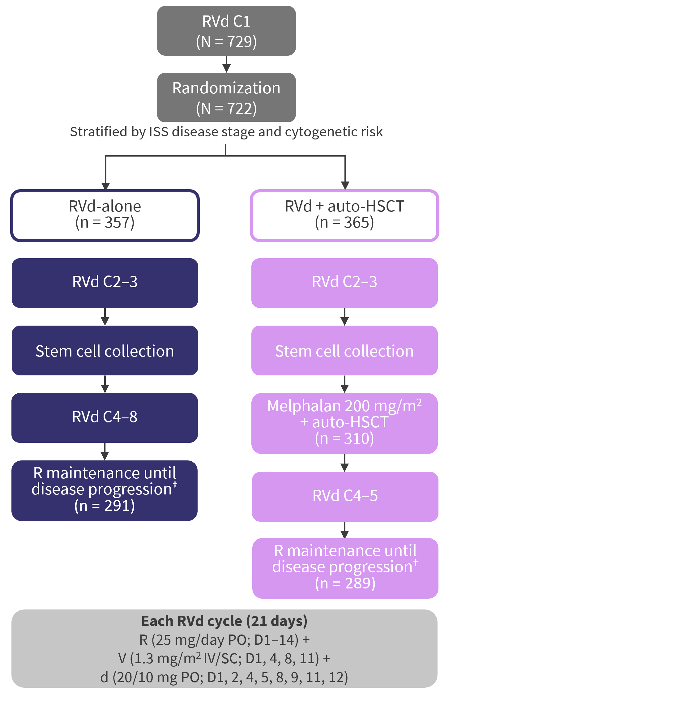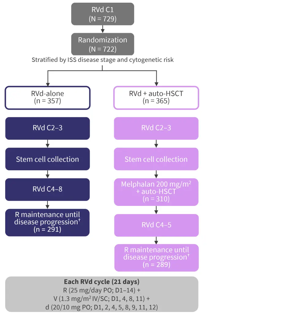 A total of 722 patients were included, with a median age of 57 years and 55 years in the RVd-alone and RVd + auto-HSCT arms, respectively. Overall, almost 19% of trial participants had an ethnicity of Black African American, which is the highest percentage so far in a phase III randomized MM trial (Table 1).
