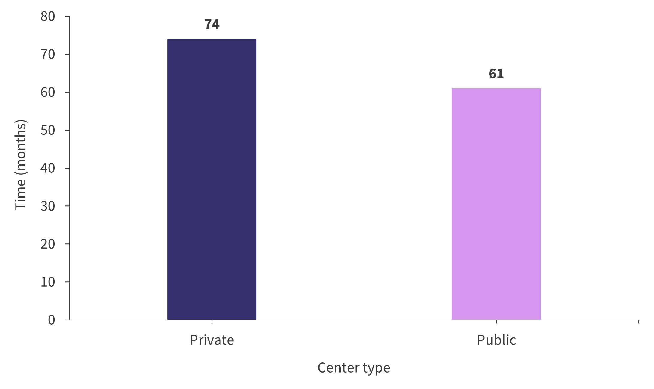 OS was associated with multiple factors, including center type (Figure 1), age, and Durie-Salmon stage. Each of these factors resulted in a significant difference in OS. The type of center (public or private) was identified as an important factor in disparity despite the fact the number of patients undergoing transplant or eligible for transplant was not significantly different between centers. Transplant eligibility did independently have an impact on median OS, with patients who are transplant-eligible having a median OS of 93 months vs 49 months in the transplant-ineligible group. This difference was maintained regardless of the type of center these patients attended.
