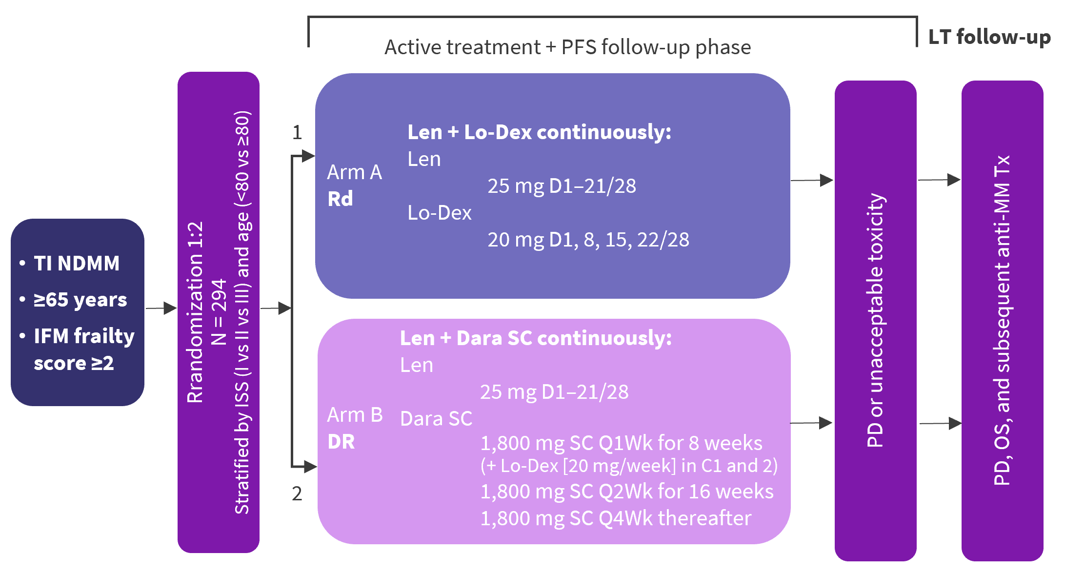 C, Cycle; Dara, daratumumab; Dex, dexamethasone; DR, lenalidomide and dexamethasone; IFM, International Myeloma Foundation; Len, lenalidomide; Lo-Dex, low-dose dexamethasone; LT, long-term; NDMM, newly diagnosed multiple myeloma; OS, overall survival; PD, progressive disease; Rd, lenalidomide and low-dose dexamethasone; SC, subcutaneous.